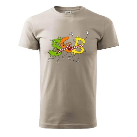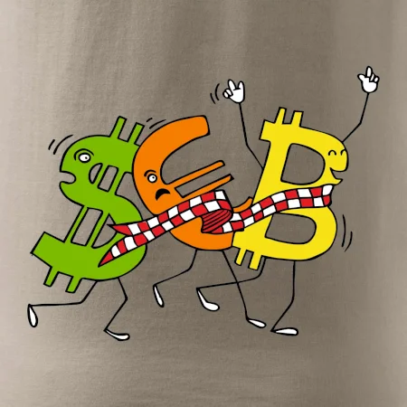 Menové tričko so symbolmi dolár, euro a bitcoin. Tričko pre zmenárnika alebo bankára.