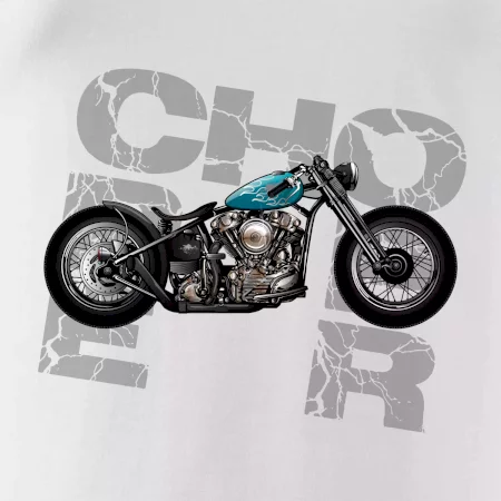Tričko pre motorkárov, na ktorom je modrá motorka chopper. Motocykel by mal mať na tričku každý správny motorkár. Moto tričko s motorkou je vhodný darček pre motorkárov.