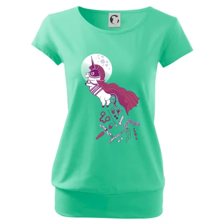 Trendové dámske tričko s veľmi krátkym rukávom, voľnejšieho strihu, v dolnom kraji všité do širokého lemu. Okrúhly priekrčník s úzkym lemom zo zhodného materiálu.