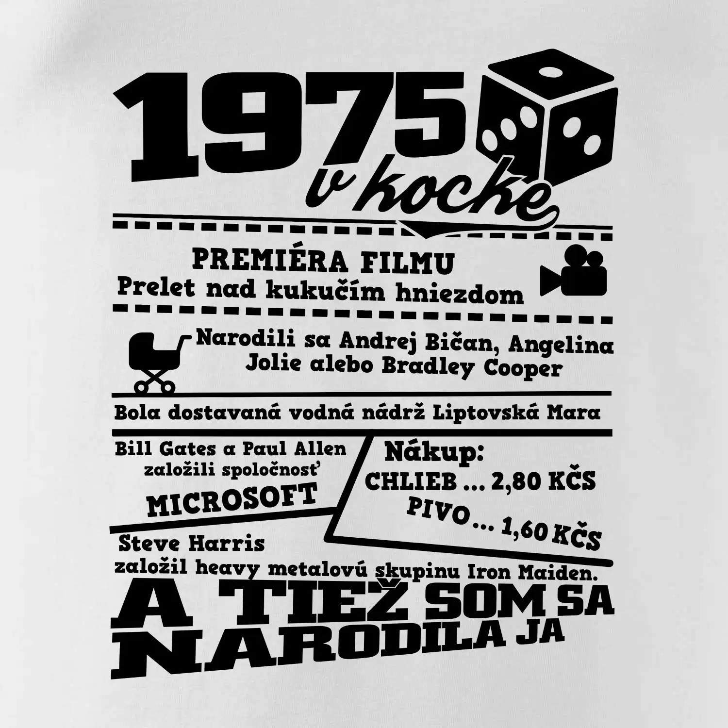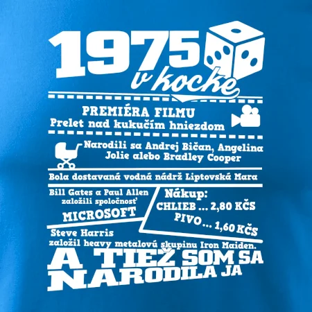 Narodeninové tričko pre ročník 1975. Zháňaš originálny darček? Tričko pre ročník 1975 v kocke je ten najlepší darček, ktorým iste potešíš. Koľko čo stálo? Kto bol prezident? Kto sa narodil? Všetko toto a ešte oveľa viac nájdeš na našom oslaveneckom triku!