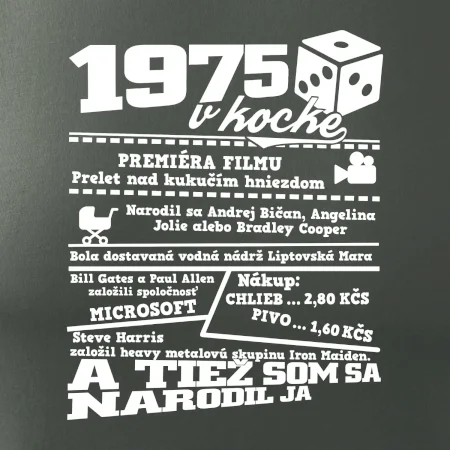 Narodeninové tričko pre ročník 1975. Zháňaš originálny darček? Tričko pre ročník 1975 v kocke je ten najlepší darček, ktorým iste potešíš. Koľko čo stálo? Kto bol prezident? Kto sa narodil? Všetko toto a ešte oveľa viac nájdeš na našom oslaveneckom triku!
