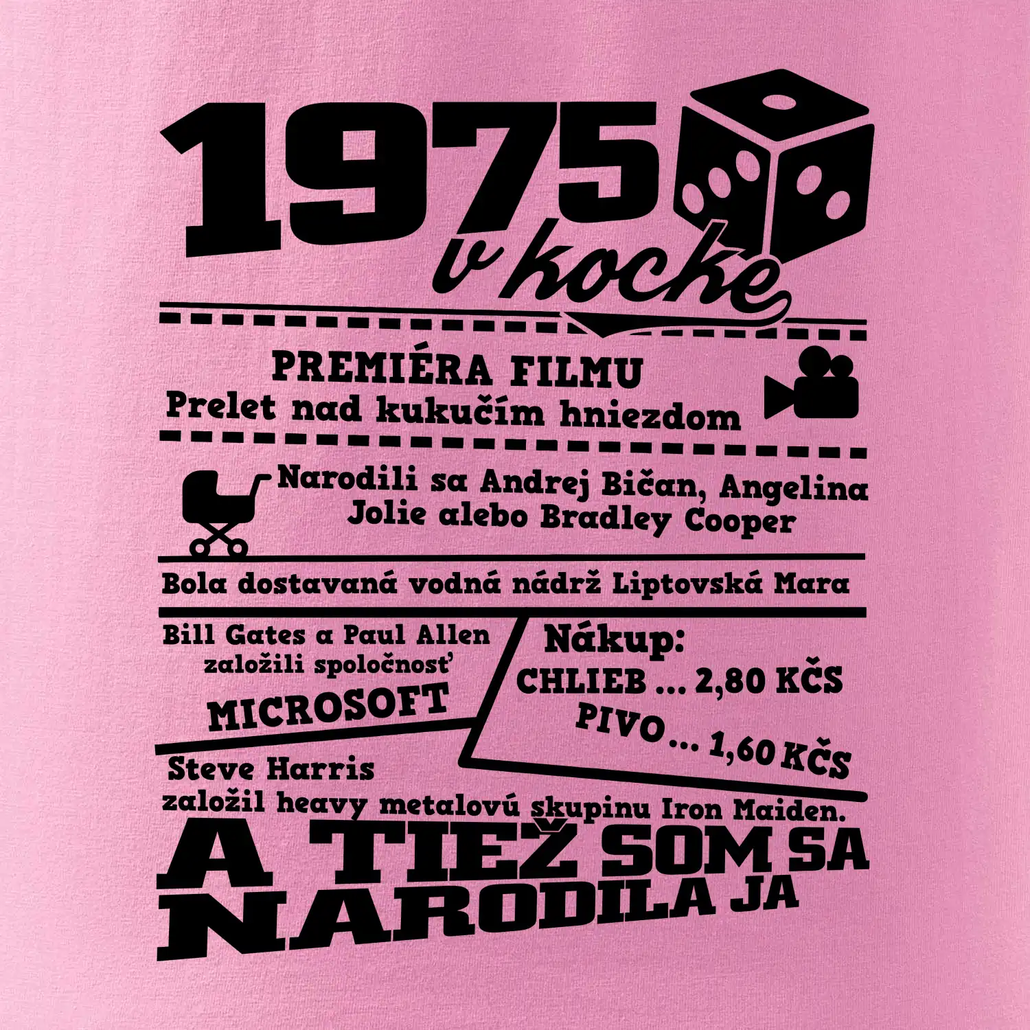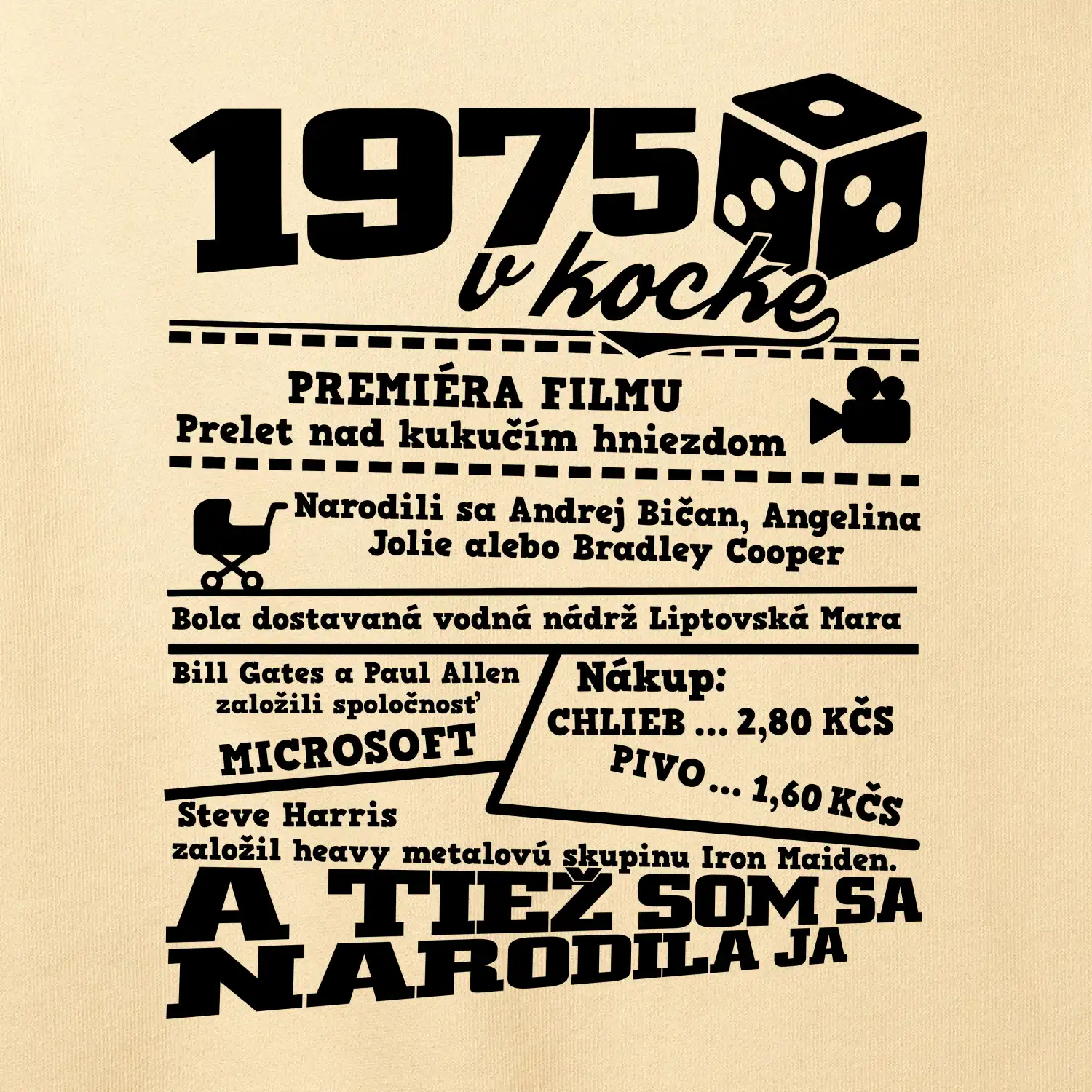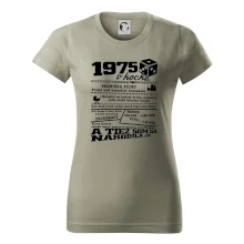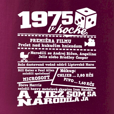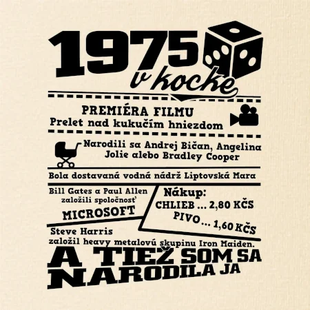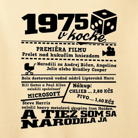Narodeninové tričko pre ročník 1975. Zháňaš originálny darček? Tričko pre ročník 1975 v kocke je ten najlepší darček, ktorým iste potešíš. Koľko čo stálo? Kto bol prezident? Kto sa narodil? Všetko toto a ešte oveľa viac nájdeš na našom oslaveneckom triku!