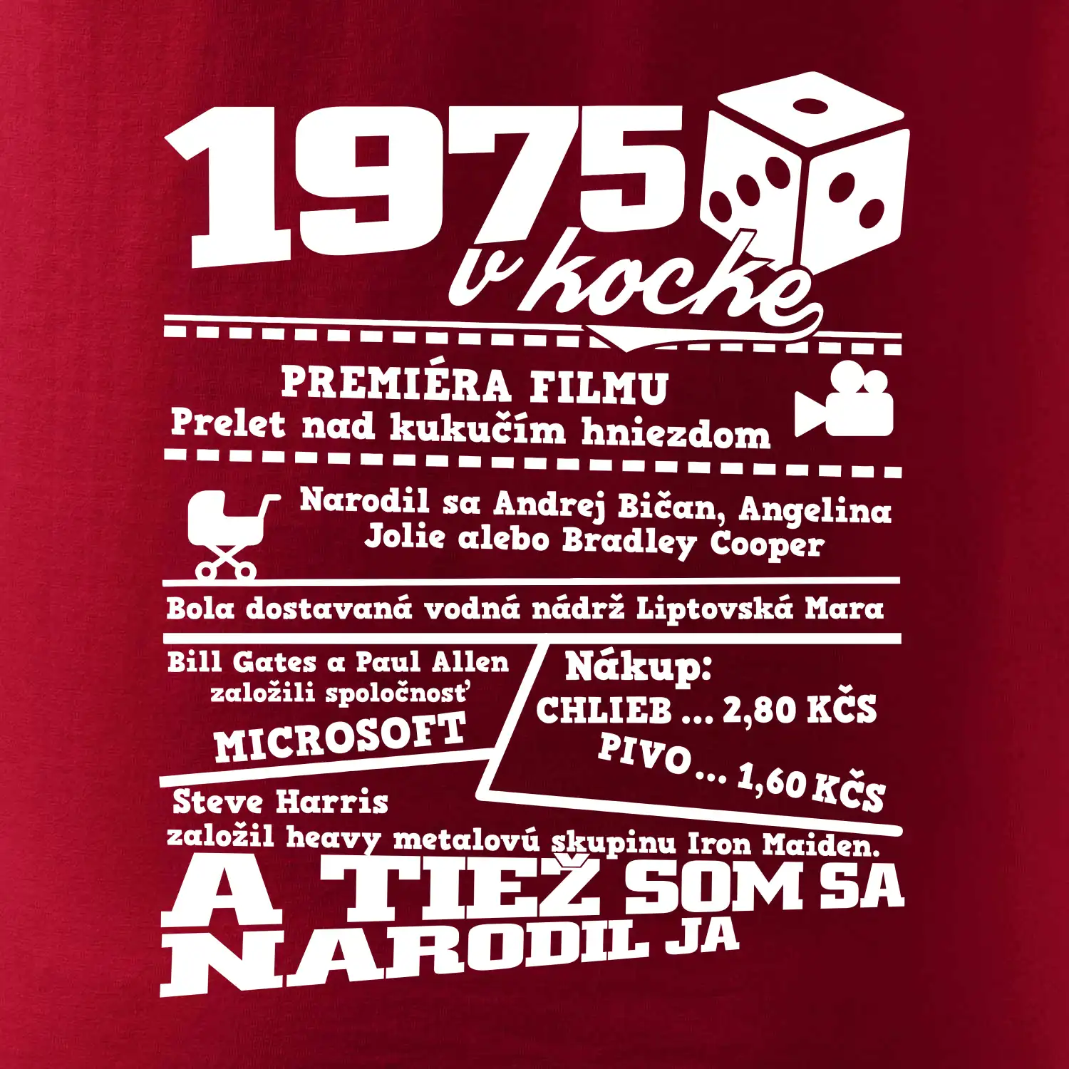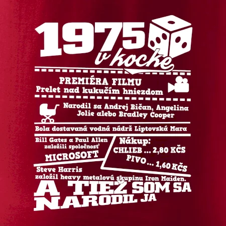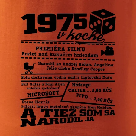Narodeninové tričko pre ročník 1975. Zháňaš originálny darček? Tričko pre ročník 1975 v kocke je ten najlepší darček, ktorým iste potešíš. Koľko čo stálo? Kto bol prezident? Kto sa narodil? Všetko toto a ešte oveľa viac nájdeš na našom oslaveneckom triku!
