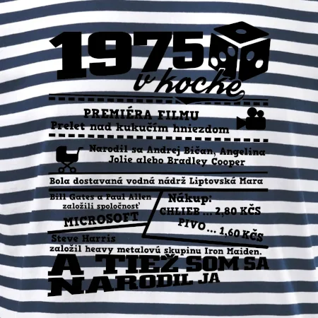 Narodeninové tričko pre ročník 1975. Zháňaš originálny darček? Tričko pre ročník 1975 v kocke je ten najlepší darček, ktorým iste potešíš. Koľko čo stálo? Kto bol prezident? Kto sa narodil? Všetko toto a ešte oveľa viac nájdeš na našom oslaveneckom triku!