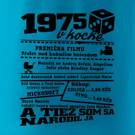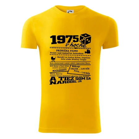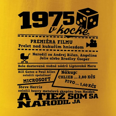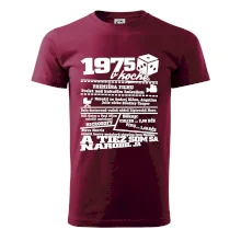 Narodeninové tričko pre ročník 1975. Zháňaš originálny darček? Tričko pre ročník 1975 v kocke je ten najlepší darček, ktorým iste potešíš. Koľko čo stálo? Kto bol prezident? Kto sa narodil? Všetko toto a ešte oveľa viac nájdeš na našom oslaveneckom triku!