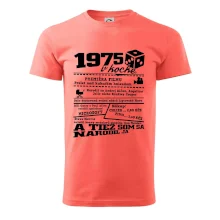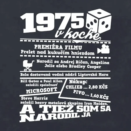 Narodeninové tričko pre ročník 1975. Zháňaš originálny darček? Tričko pre ročník 1975 v kocke je ten najlepší darček, ktorým iste potešíš. Koľko čo stálo? Kto bol prezident? Kto sa narodil? Všetko toto a ešte oveľa viac nájdeš na našom oslaveneckom triku!