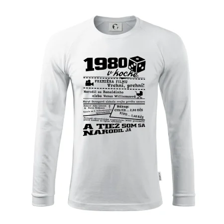 Narodeninové tričko pre ročník 1980. Zháňaš originálny darček? Tričko pre ročník 1980 v kocke je ten najlepší darček, ktorým určite potešíš. Koľko čo stálo? Kto bol prezident? Kto sa narodil? Všetko toto a ešte oveľa viac nájdeš na našom narodeninovom triku!