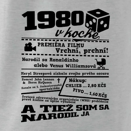 Narodeninové tričko pre ročník 1980. Zháňaš originálny darček? Tričko pre ročník 1980 v kocke je ten najlepší darček, ktorým určite potešíš. Koľko čo stálo? Kto bol prezident? Kto sa narodil? Všetko toto a ešte oveľa viac nájdeš na našom narodeninovom triku!