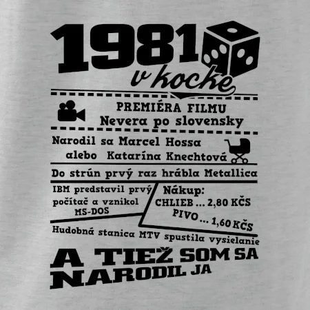 Narodeninové tričko pre ročník 1981. Zháňaš originálny darček? Tričko pre ročník 1981 v kocke je ten najlepší darček, ktorým určite potešíš. Koľko čo stálo? Kto bol prezident? Kto sa narodil? Všetko toto a ešte oveľa viac nájdeš na našom narodeninovom triku!