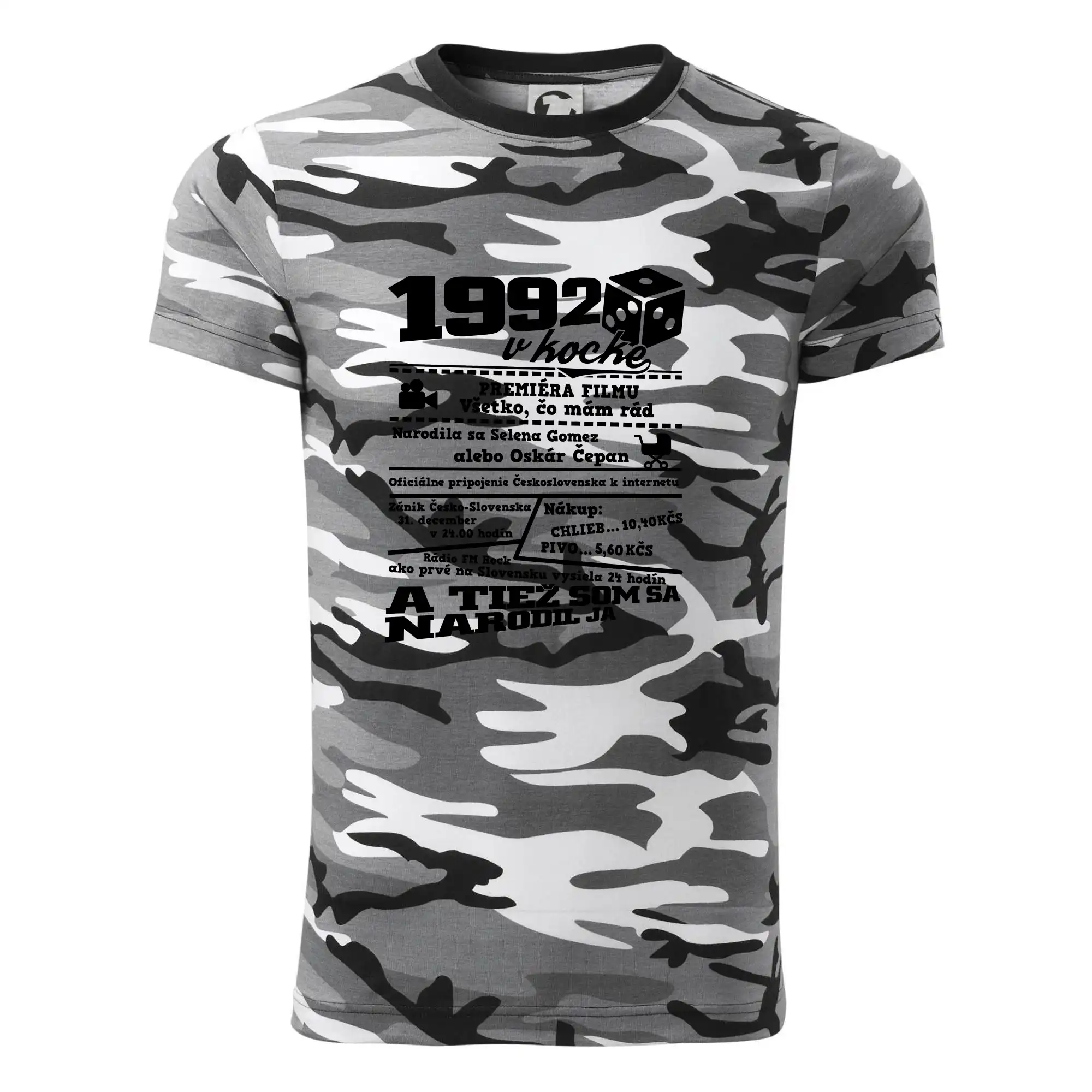 Tričko strednej gramáže vo farbách camouflage. Strih s bočnými švami. Lem priekrčníku z rebrového úpletu s prídavkom 5% elastanu. Vnútorná časť zadného priekrčníka začistená páskou vo farbe camouflage.