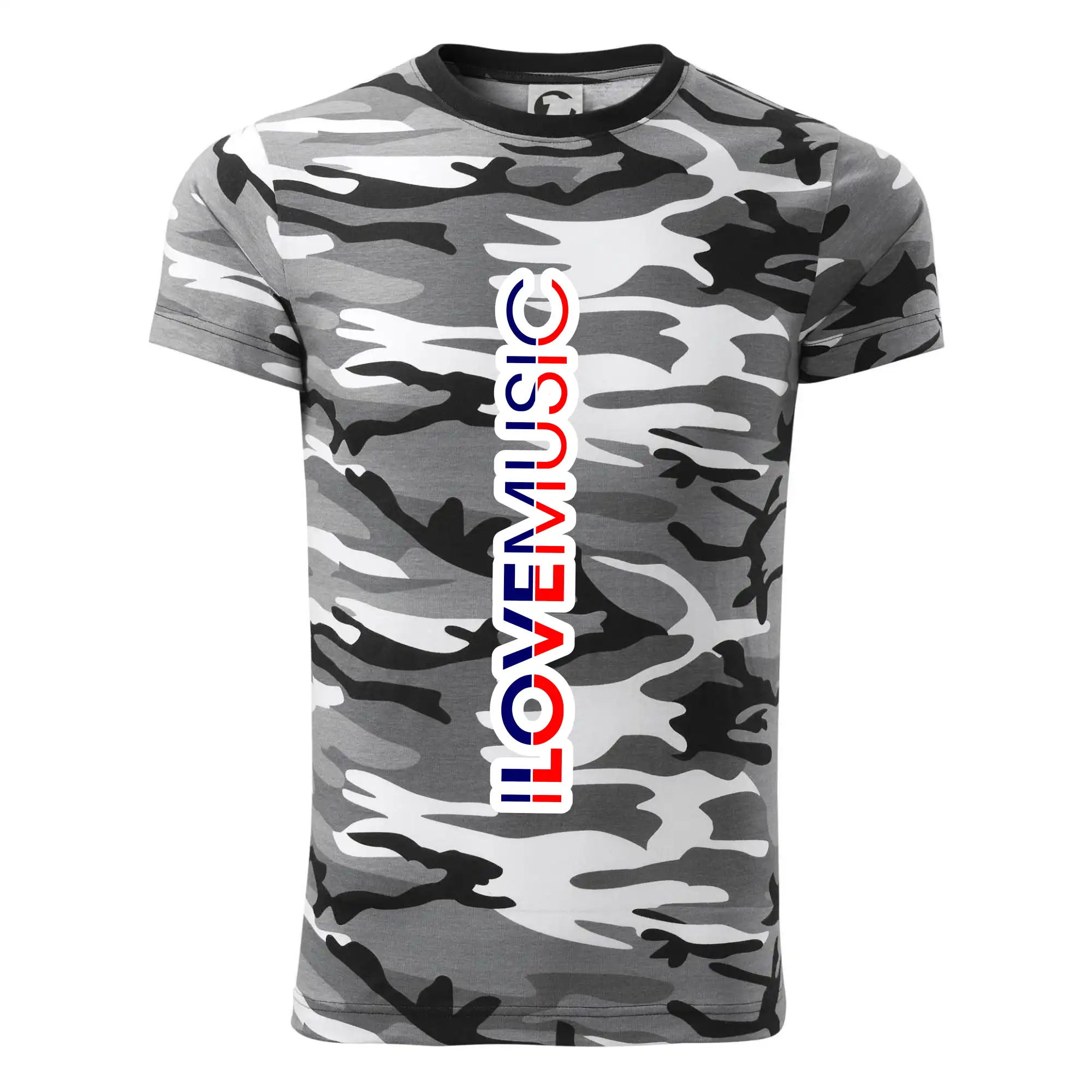 Tričko strednej gramáže vo farbách camouflage. Strih s bočnými švami. Lem priekrčníku z rebrového úpletu s prídavkom 5% elastanu. Vnútorná časť zadného priekrčníka začistená páskou vo farbe camouflage.