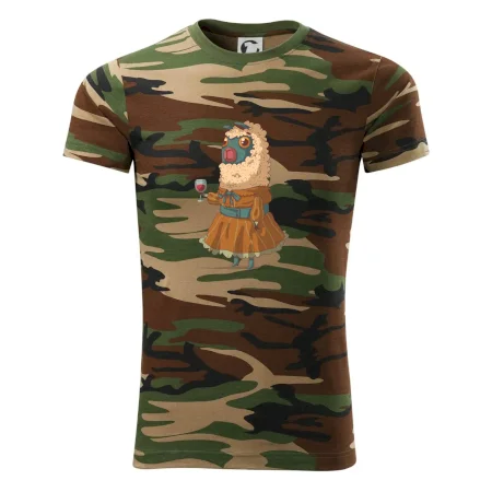 Tričko strednej gramáže vo farbách camouflage. Strih s bočnými švami. Lem priekrčníku z rebrového úpletu s prídavkom 5% elastanu. Vnútorná časť zadného priekrčníka začistená páskou vo farbe camouflage.