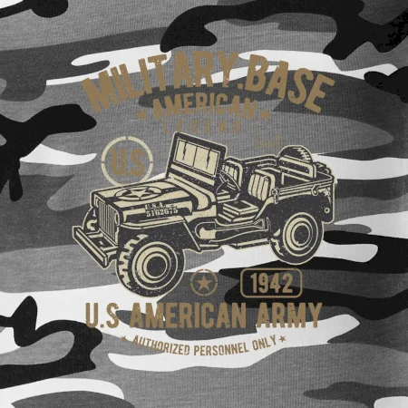 Tričko strednej gramáže vo farbách camouflage. Strih s bočnými švami. Lem priekrčníku z rebrového úpletu s prídavkom 5% elastanu. Vnútorná časť zadného priekrčníka začistená páskou vo farbe camouflage.