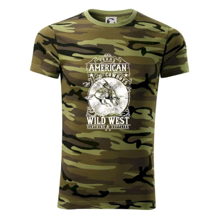 Tričko strednej gramáže vo farbách camouflage. Strih s bočnými švami. Lem priekrčníku z rebrového úpletu s prídavkom 5% elastanu. Vnútorná časť zadného priekrčníka začistená páskou vo farbe camouflage.