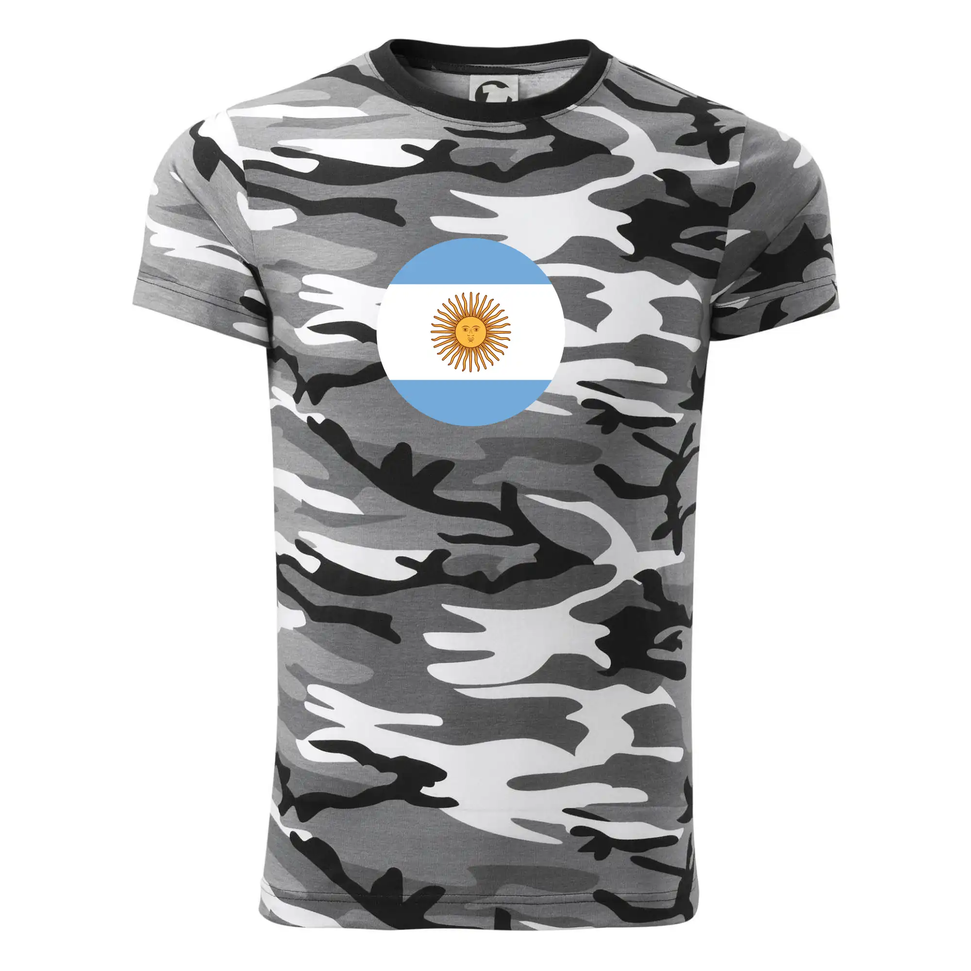 Tričko strednej gramáže vo farbách camouflage. Strih s bočnými švami. Lem priekrčníku z rebrového úpletu s prídavkom 5% elastanu. Vnútorná časť zadného priekrčníka začistená páskou vo farbe camouflage.