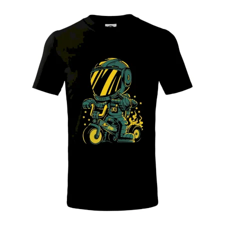 Detské tričko strednej gramáže s bočnými švami. Úzky priekrčník s prídavkom 5% elastanu. Vnútorná časť zadného priekrčníka začistená tkanou páskou. Spevnený ramenný šev.