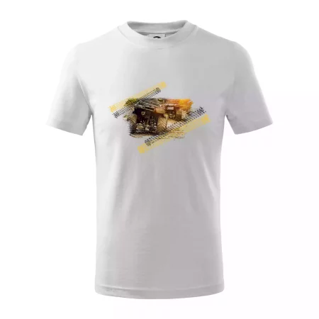 Detské tričko strednej gramáže s bočnými švami. Úzky priekrčník s prídavkom 5% elastanu. Vnútorná časť zadného priekrčníka začistená tkanou páskou. Spevnený ramenný šev.