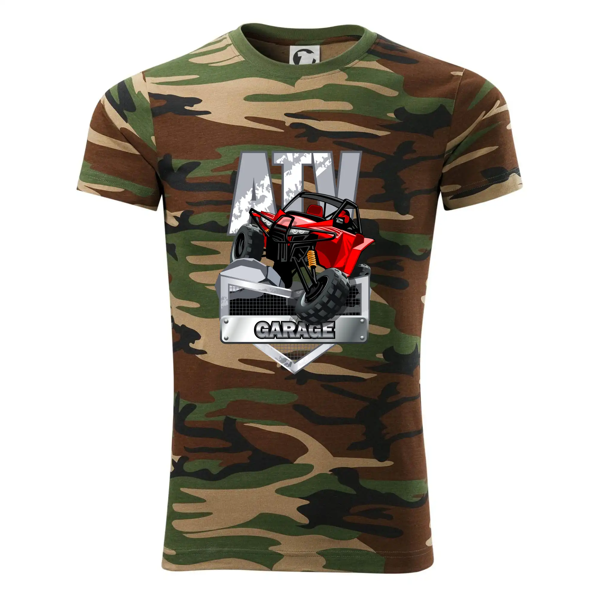 Tričko pre motoristu, na ktorom je červená štvorkolka ATV. Motoristické tričko so štvorkolkou musí mať doma každý motorista. Tričko s autom je vhodný darček pre motoristu, ktorý má rád adrenalín. Auto na tričku je ako živé.