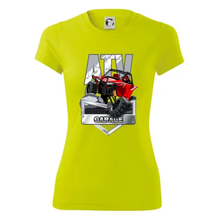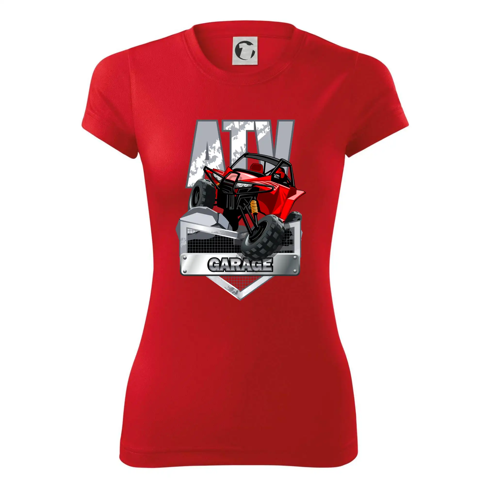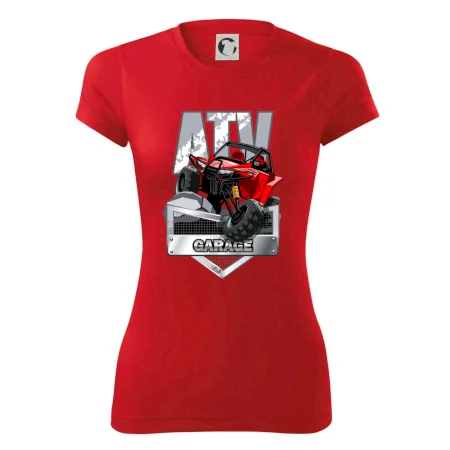 Tričko pre motoristu, na ktorom je červená štvorkolka ATV. Motoristické tričko so štvorkolkou musí mať doma každý motorista. Tričko s autom je vhodný darček pre motoristu, ktorý má rád adrenalín. Auto na tričku je ako živé.