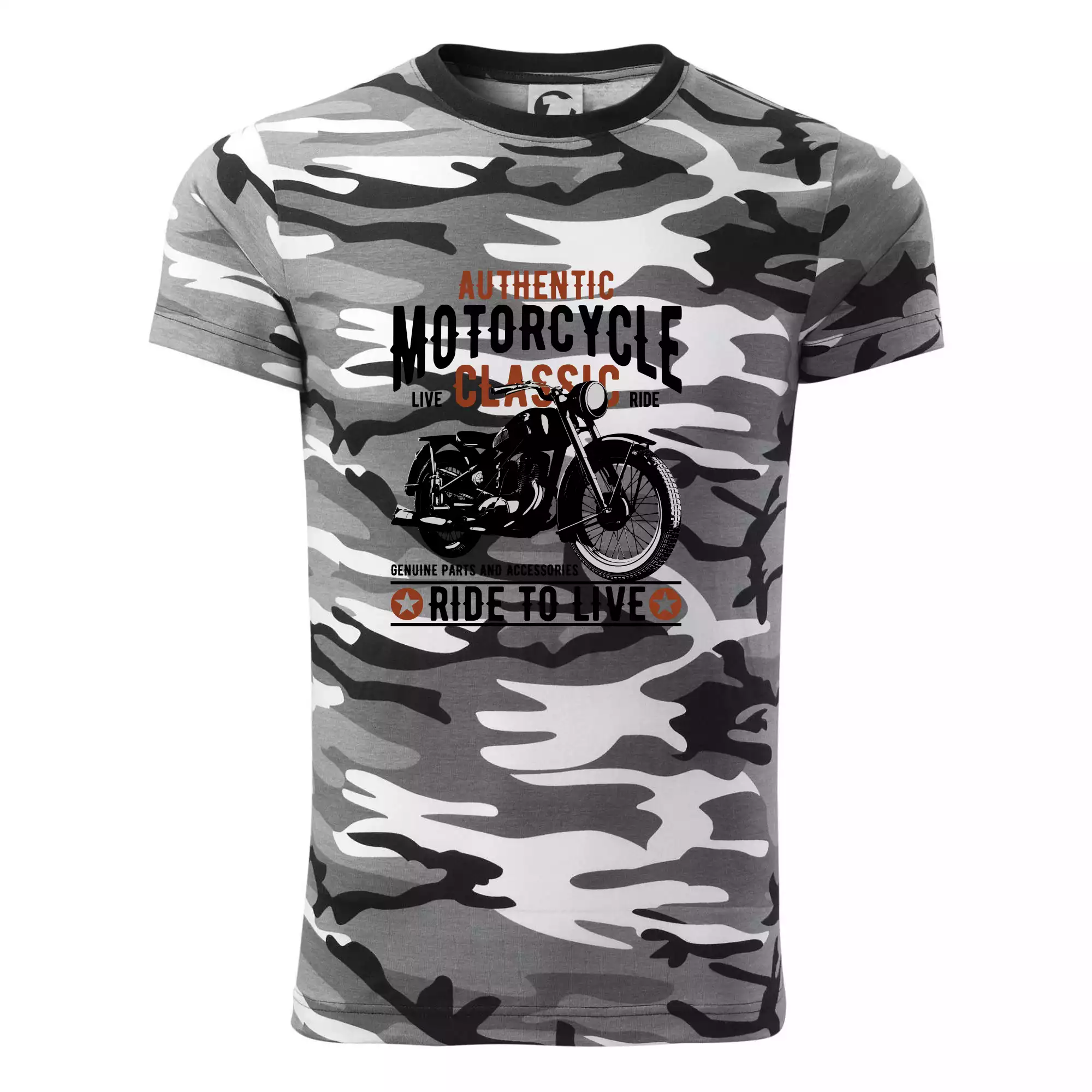 Tričko strednej gramáže vo farbách camouflage. Strih s bočnými švami. Lem priekrčníku z rebrového úpletu s prídavkom 5% elastanu. Vnútorná časť zadného priekrčníka začistená páskou vo farbe camouflage.