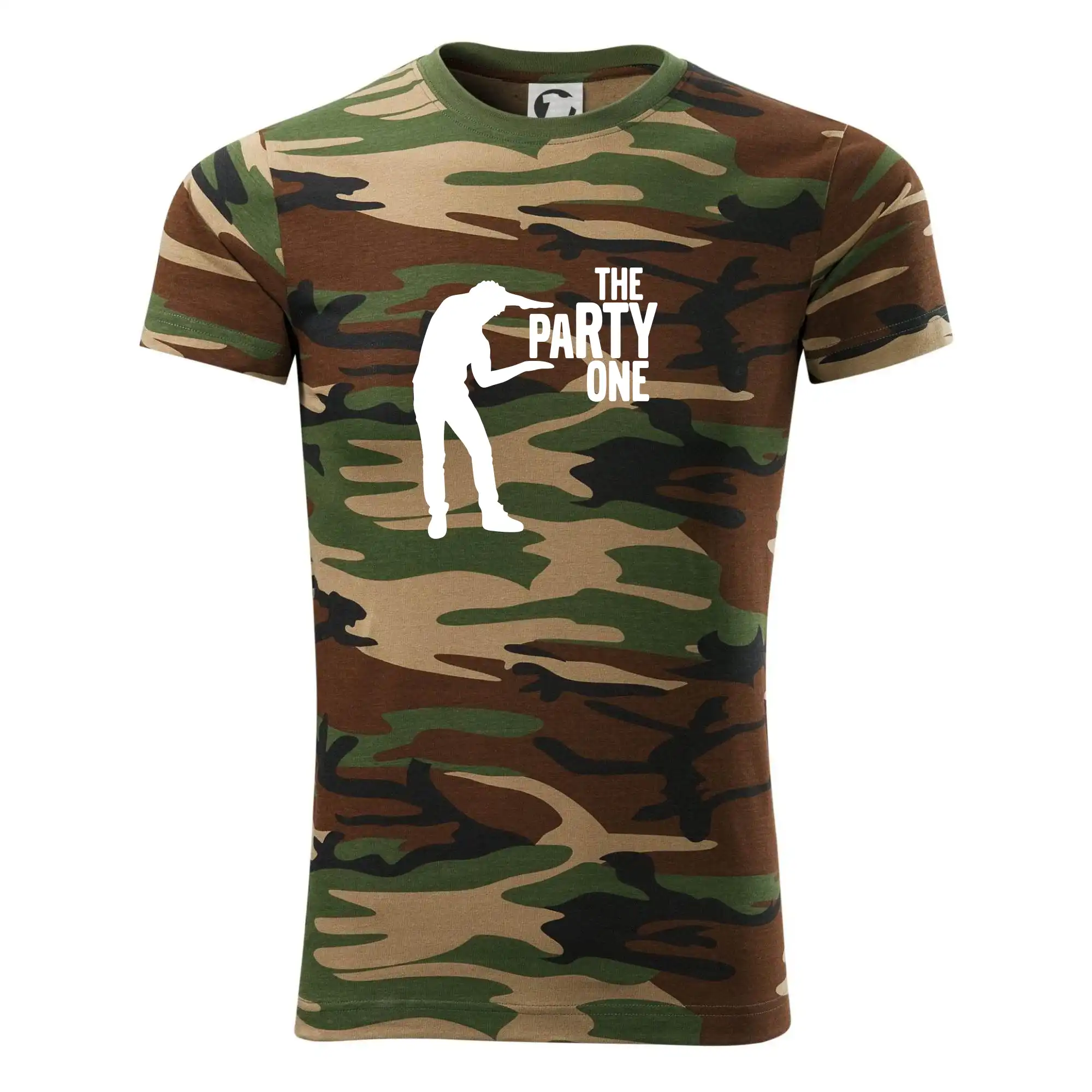 Tričko strednej gramáže vo farbách camouflage. Strih s bočnými švami. Lem priekrčníku z rebrového úpletu s prídavkom 5% elastanu. Vnútorná časť zadného priekrčníka začistená páskou vo farbe camouflage.