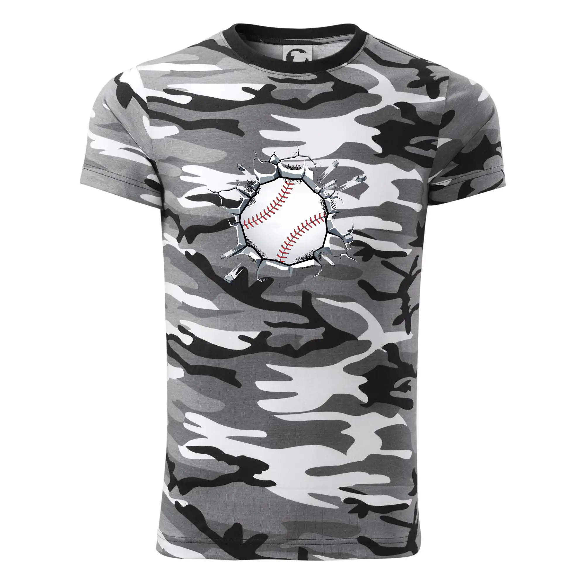 Tričko strednej gramáže vo farbách camouflage. Strih s bočnými švami. Lem priekrčníku z rebrového úpletu s prídavkom 5% elastanu. Vnútorná časť zadného priekrčníka začistená páskou vo farbe camouflage.