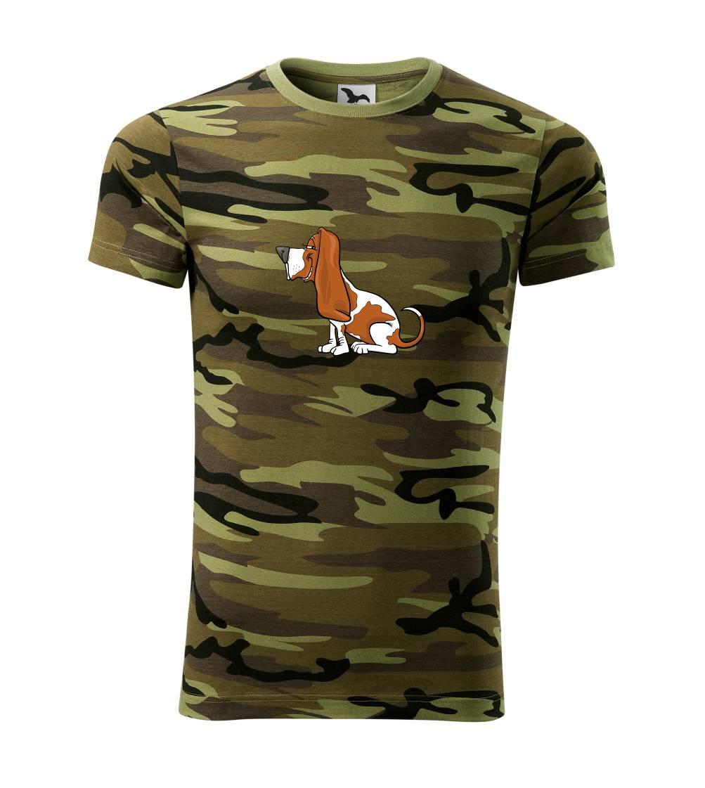 Tričko strednej gramáže vo farbách camouflage. Strih s bočnými švami. Lem priekrčníku z rebrového úpletu s prídavkom 5% elastanu. Vnútorná časť zadného priekrčníka začistená páskou vo farbe camouflage.
