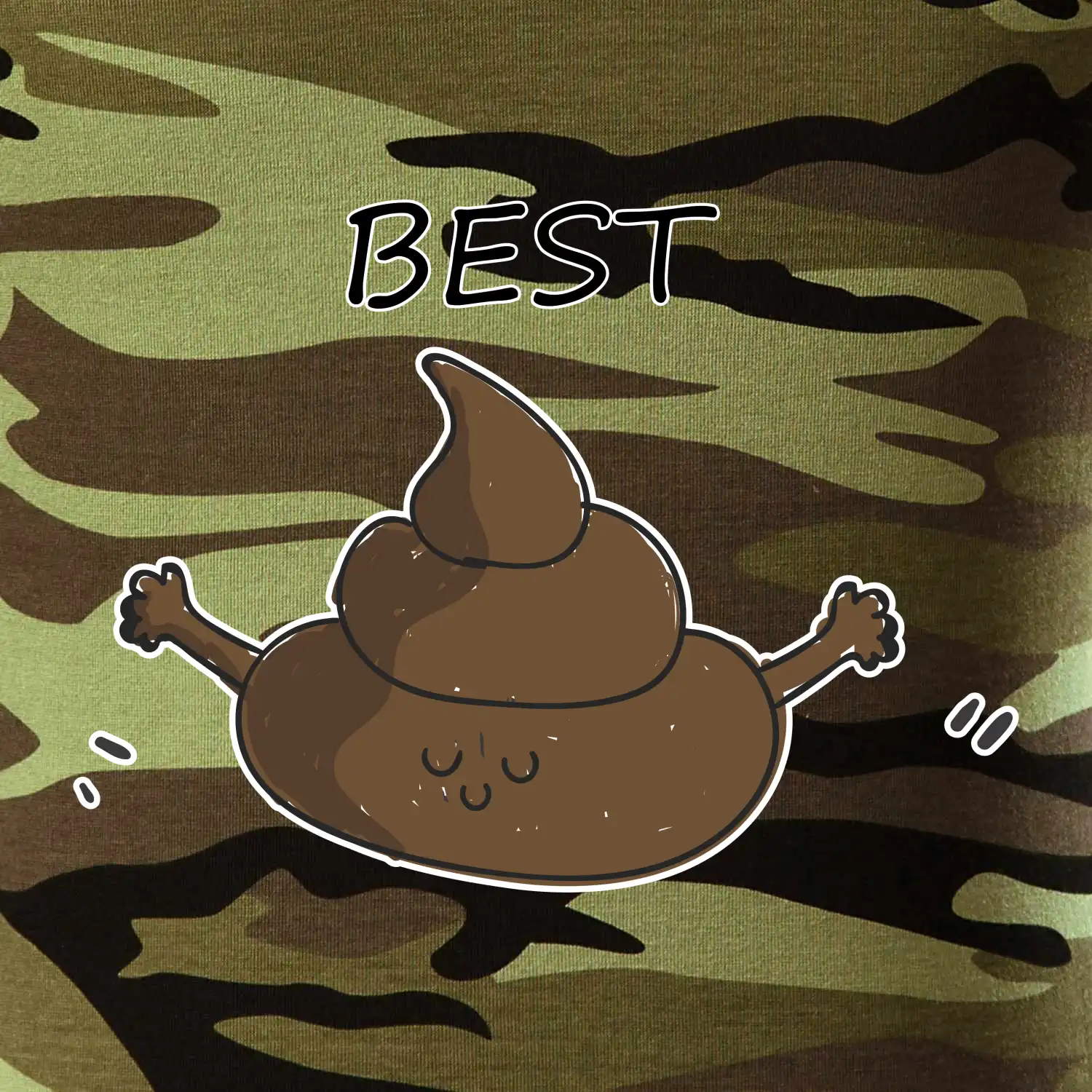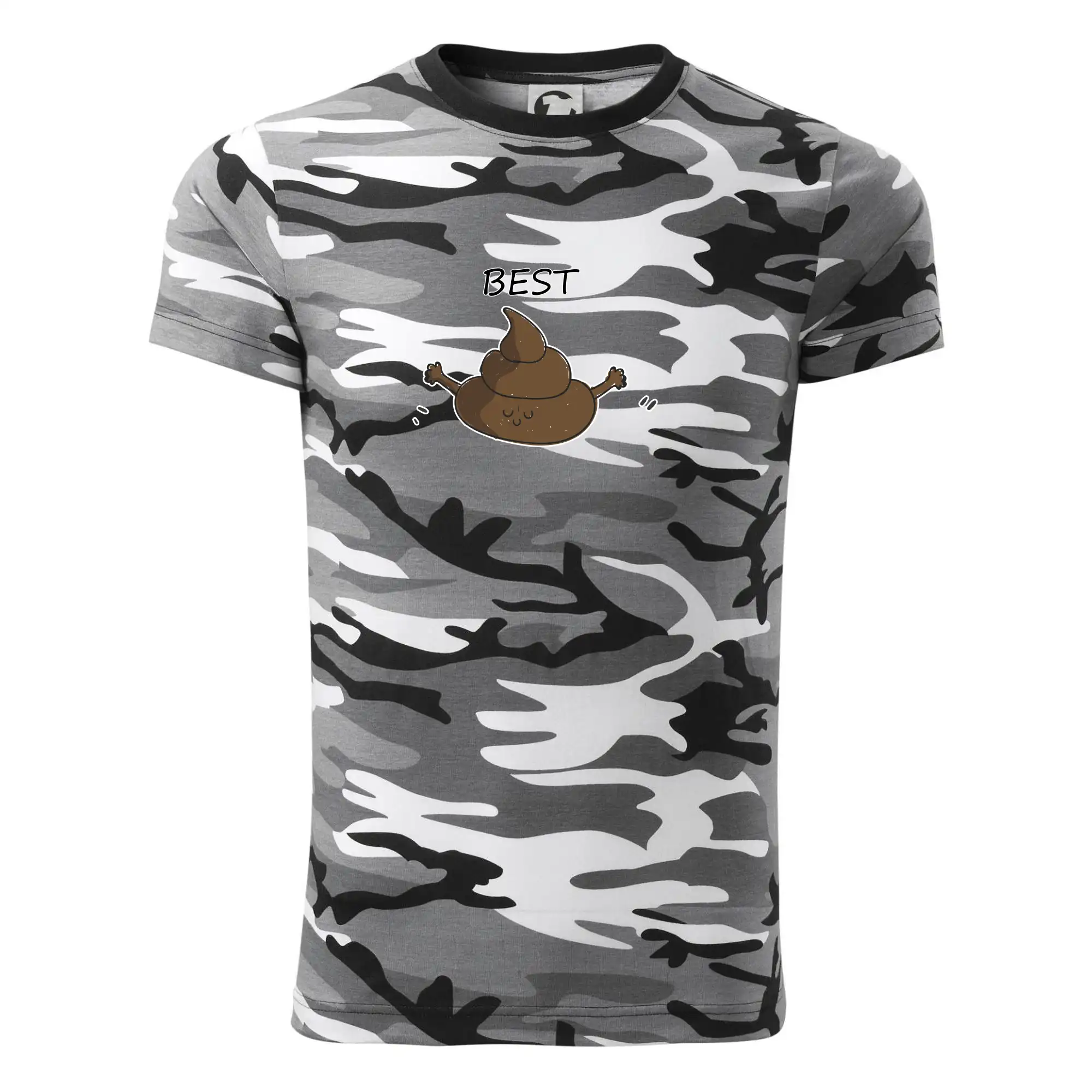 Tričko strednej gramáže vo farbách camouflage. Strih s bočnými švami. Lem priekrčníku z rebrového úpletu s prídavkom 5% elastanu. Vnútorná časť zadného priekrčníka začistená páskou vo farbe camouflage.