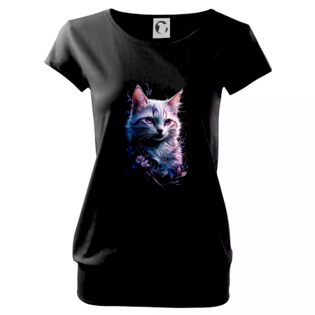 Trendové dámske tričko s veľmi krátkym rukávom, voľnejšieho strihu, v dolnom kraji všité do širokého lemu. Okrúhly priekrčník s úzkym lemom zo zhodného materiálu.