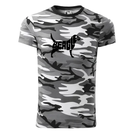 Tričko strednej gramáže vo farbách camouflage. Strih s bočnými švami. Lem priekrčníku z rebrového úpletu s prídavkom 5% elastanu. Vnútorná časť zadného priekrčníka začistená páskou vo farbe camouflage.