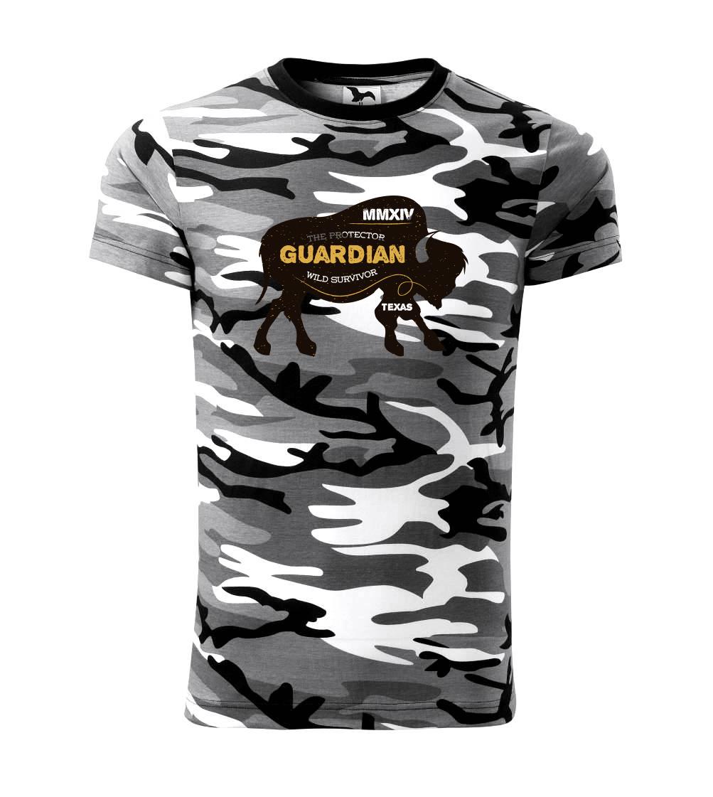 Tričko strednej gramáže vo farbách camouflage. Strih s bočnými švami. Lem priekrčníku z rebrového úpletu s prídavkom 5% elastanu. Vnútorná časť zadného priekrčníka začistená páskou vo farbe camouflage.