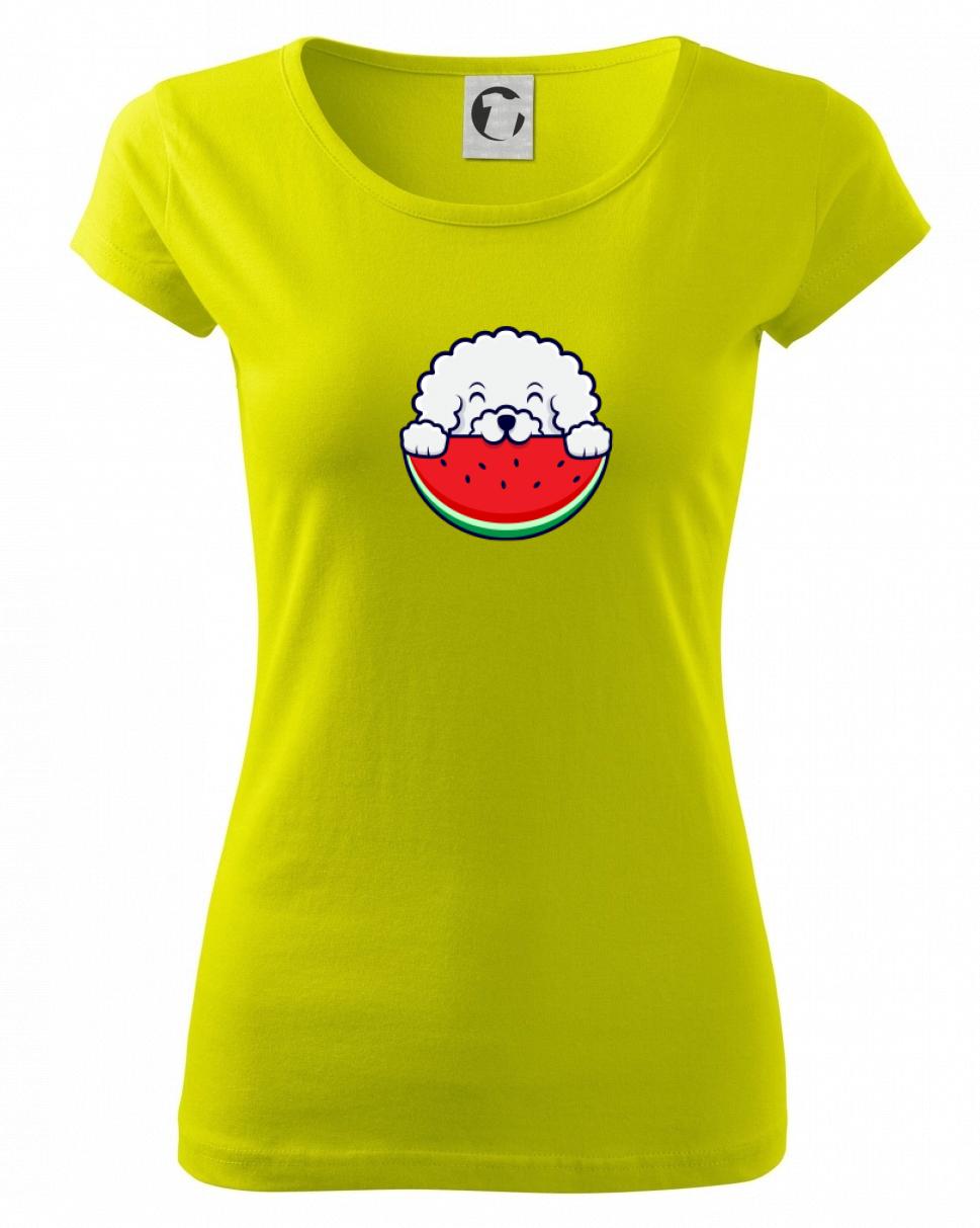 Triko s bišonkem a melounem jako skvělý dárek pro paničku bišonka. Bišonek na triku je esence roztomilosti. Krásný bílý malý pes společenské povahy je jeden z nejroztomilejších, které si můžete u nás pořídit.