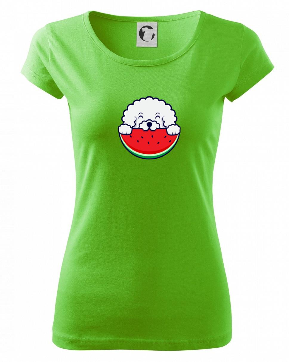 Triko s bišonkem a melounem jako skvělý dárek pro paničku bišonka. Bišonek na triku je esence roztomilosti. Krásný bílý malý pes společenské povahy je jeden z nejroztomilejších, které si můžete u nás pořídit.