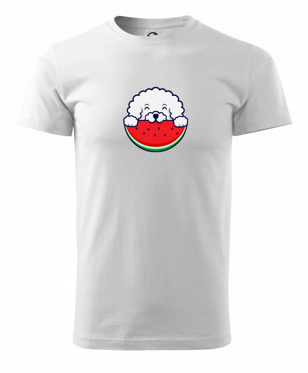 Triko s bišonkem a melounem jako skvělý dárek pro paničku bišonka. Bišonek na triku je esence roztomilosti. Krásný bílý malý pes společenské povahy je jeden z nejroztomilejších, které si můžete u nás pořídit.