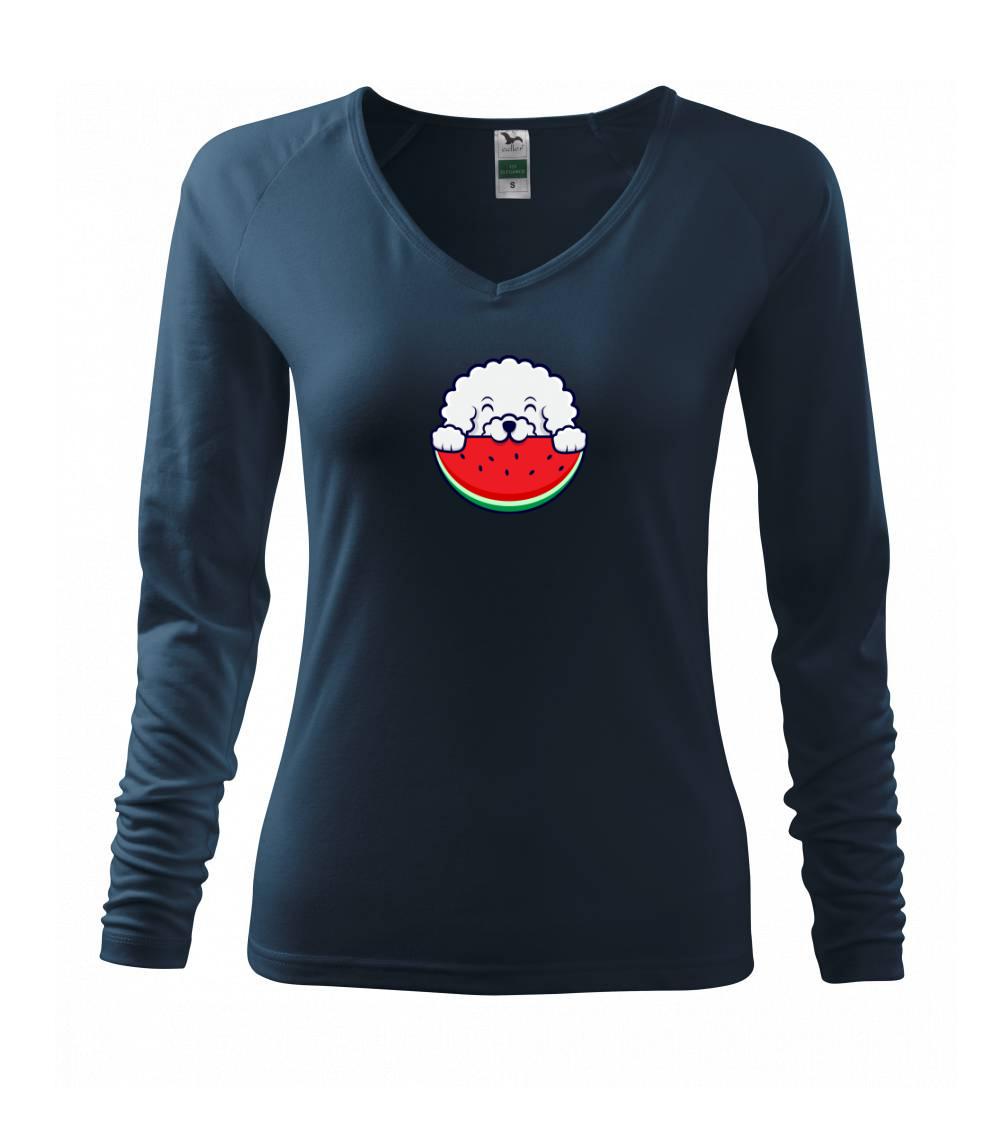 Triko s bišonkem a melounem jako skvělý dárek pro paničku bišonka. Bišonek na triku je esence roztomilosti. Krásný bílý malý pes společenské povahy je jeden z nejroztomilejších, které si můžete u nás pořídit.