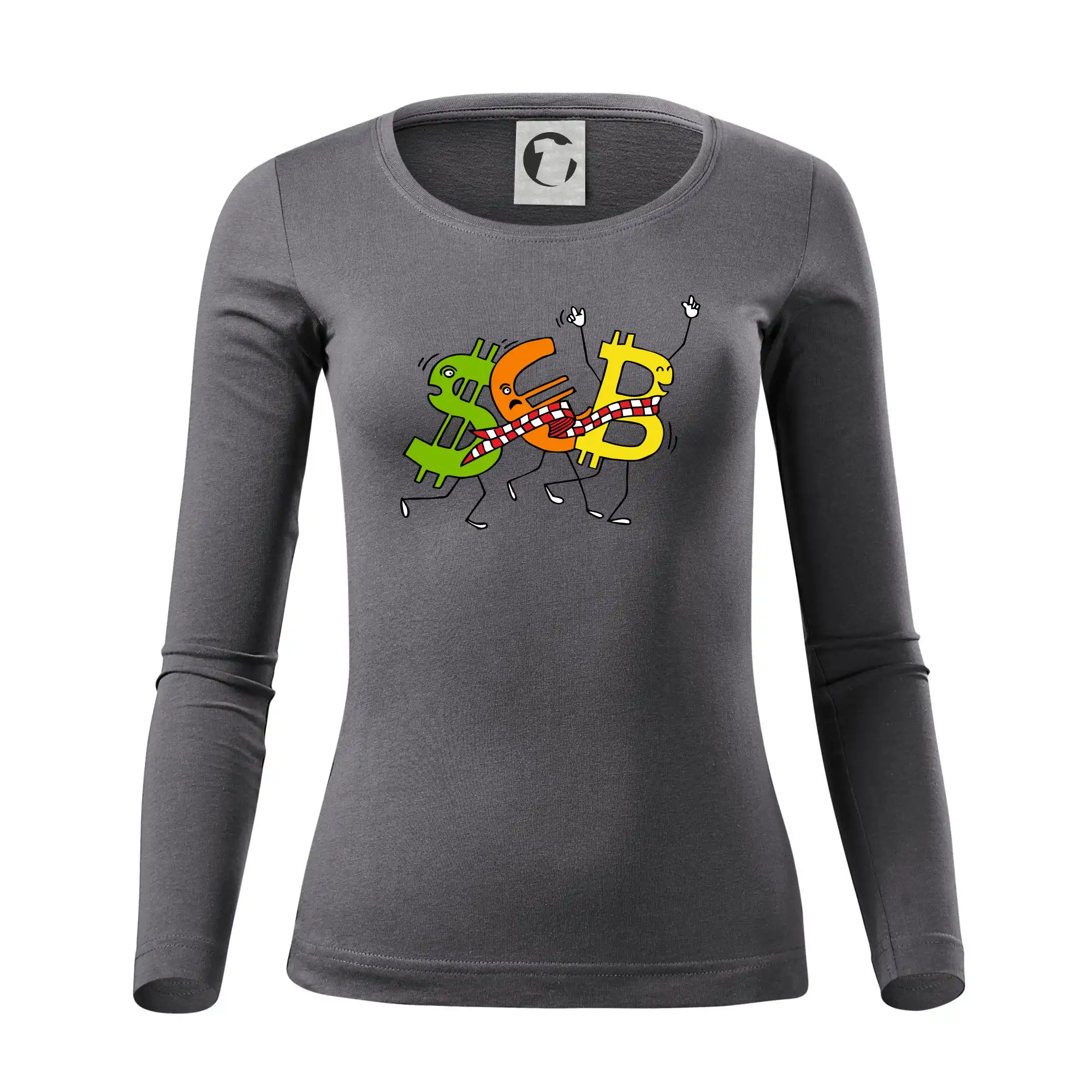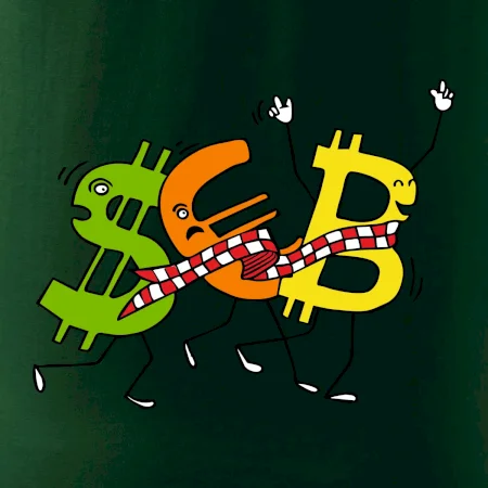Menové tričko so symbolmi dolár, euro a bitcoin. Tričko pre zmenárnika alebo bankára.