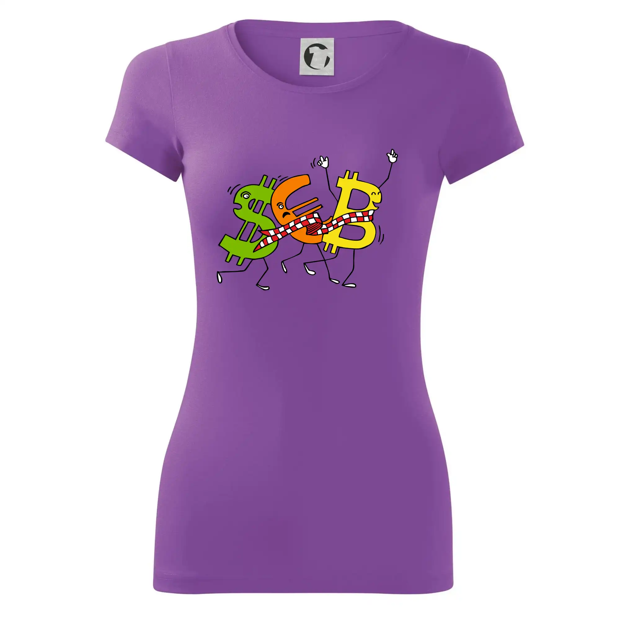 Menové tričko so symbolmi dolár, euro a bitcoin. Tričko pre zmenárnika alebo bankára.