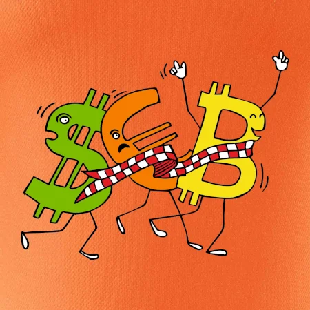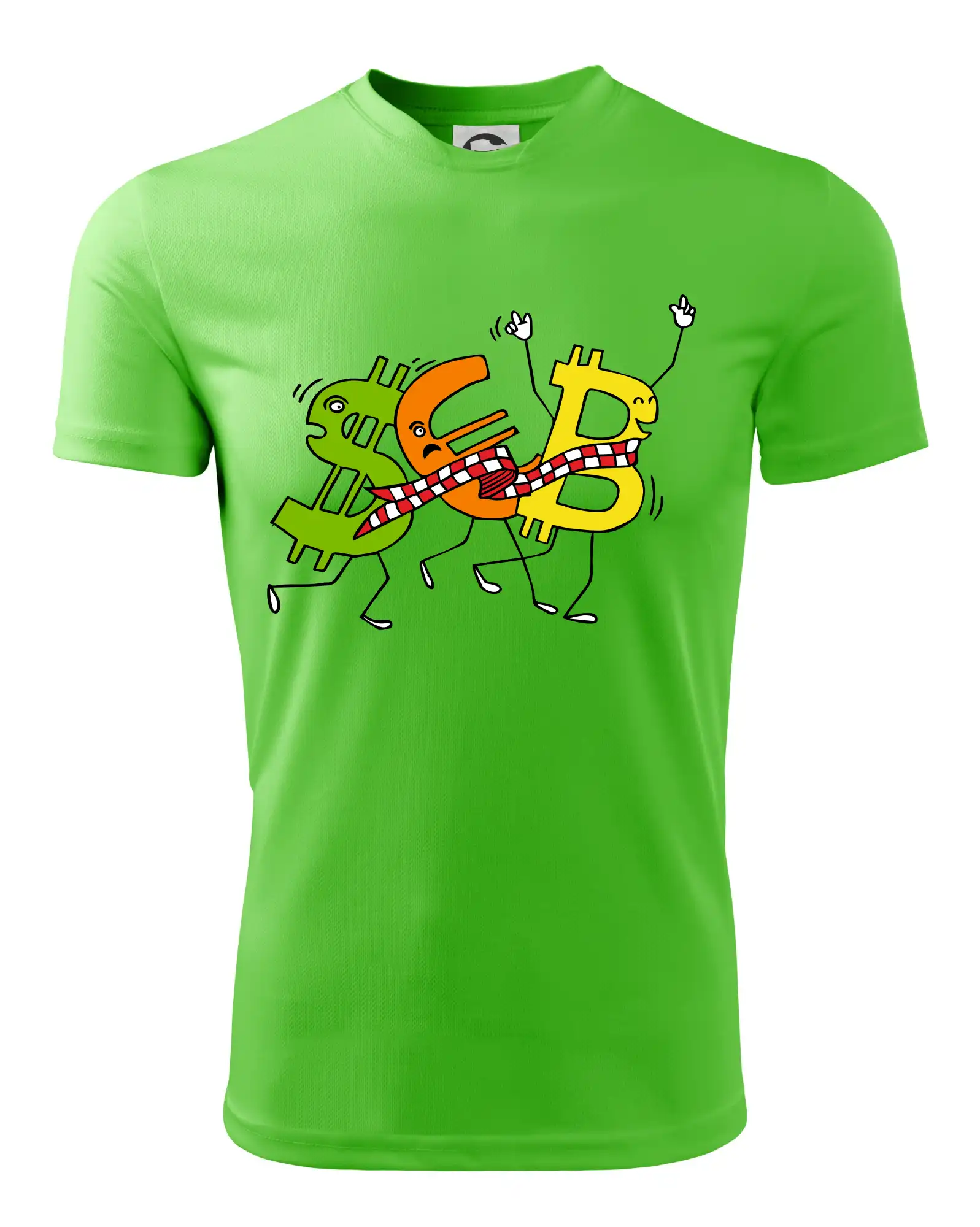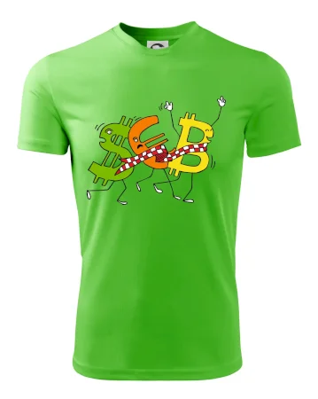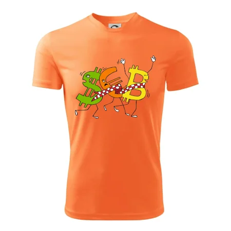 Menové tričko so symbolmi dolár, euro a bitcoin. Tričko pre zmenárnika alebo bankára.