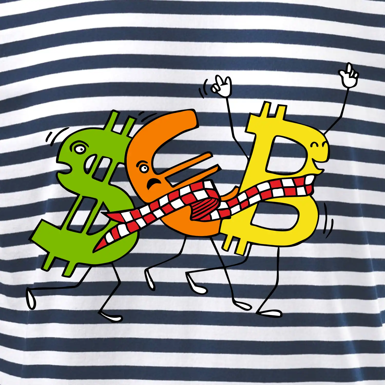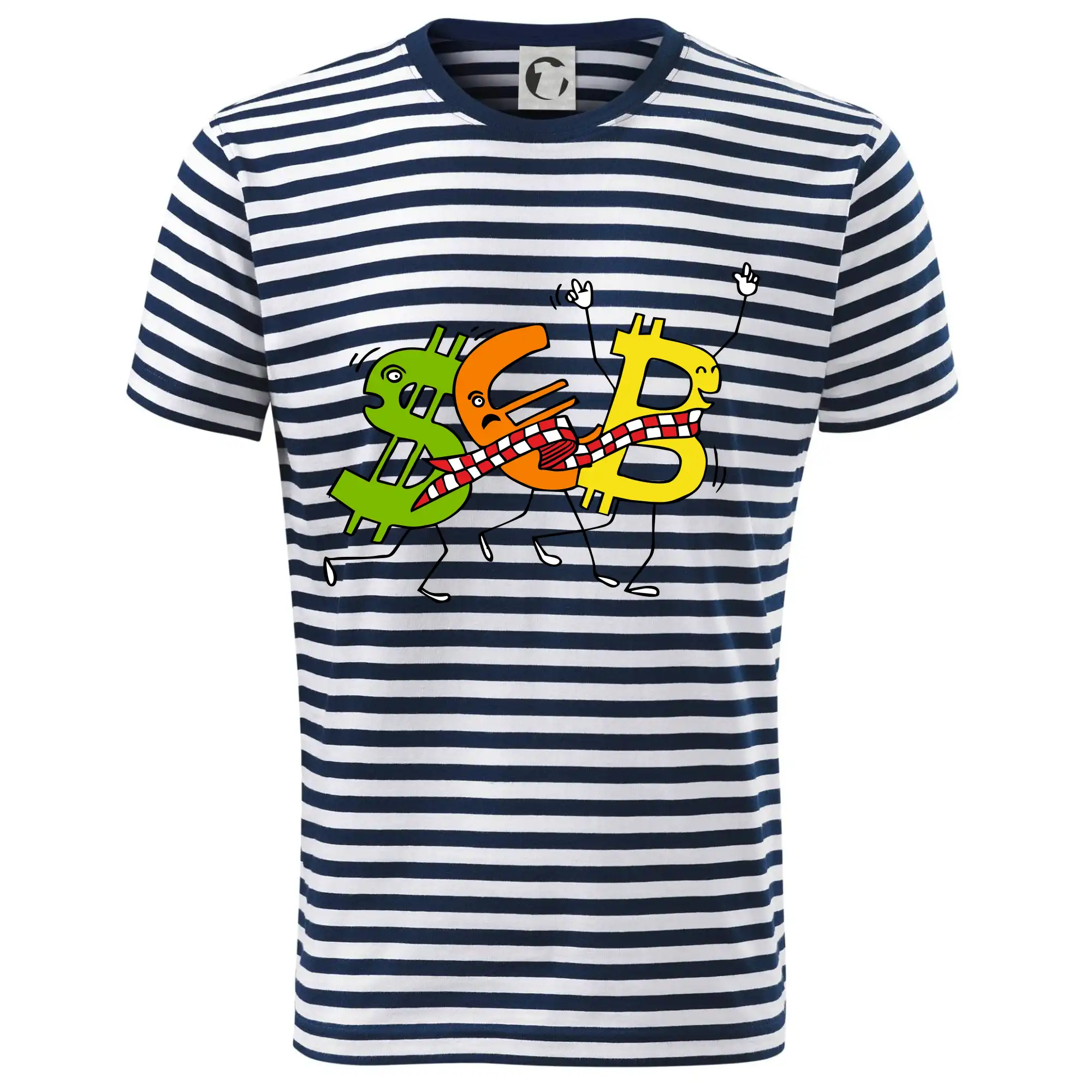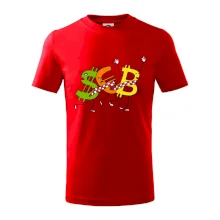 Menové tričko so symbolmi dolár, euro a bitcoin. Tričko pre zmenárnika alebo bankára.