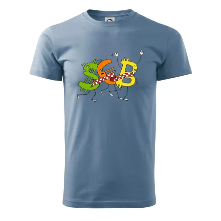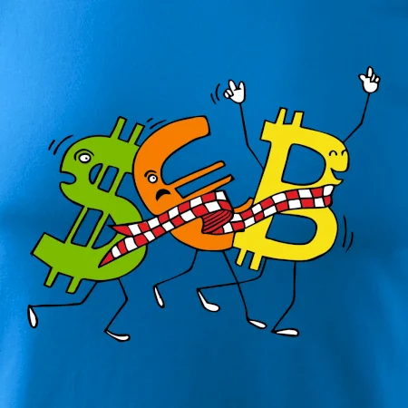 Menové tričko so symbolmi dolár, euro a bitcoin. Tričko pre zmenárnika alebo bankára.