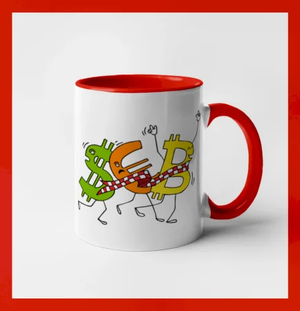 Menové tričko so symbolmi dolár, euro a bitcoin. Tričko pre zmenárnika alebo bankára.