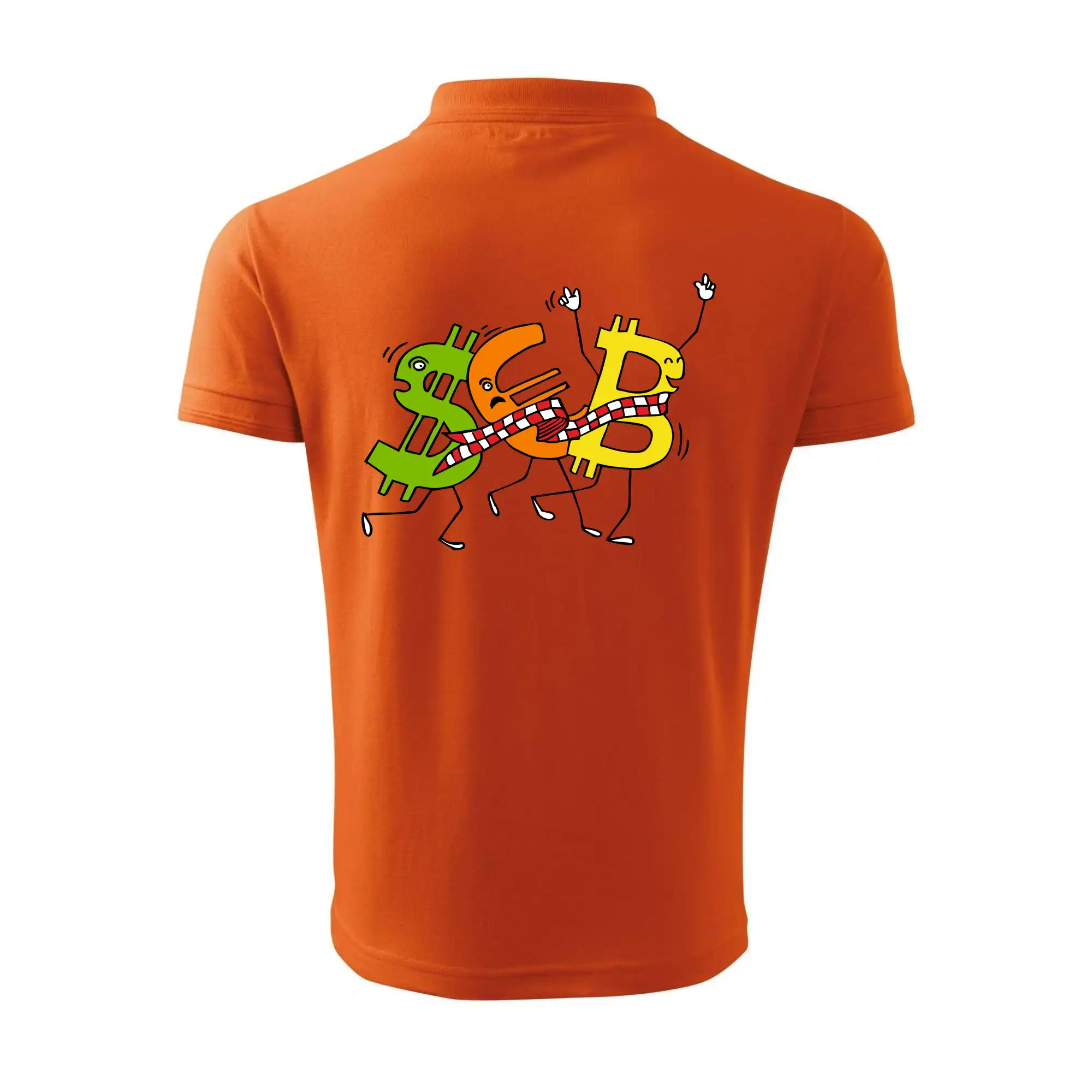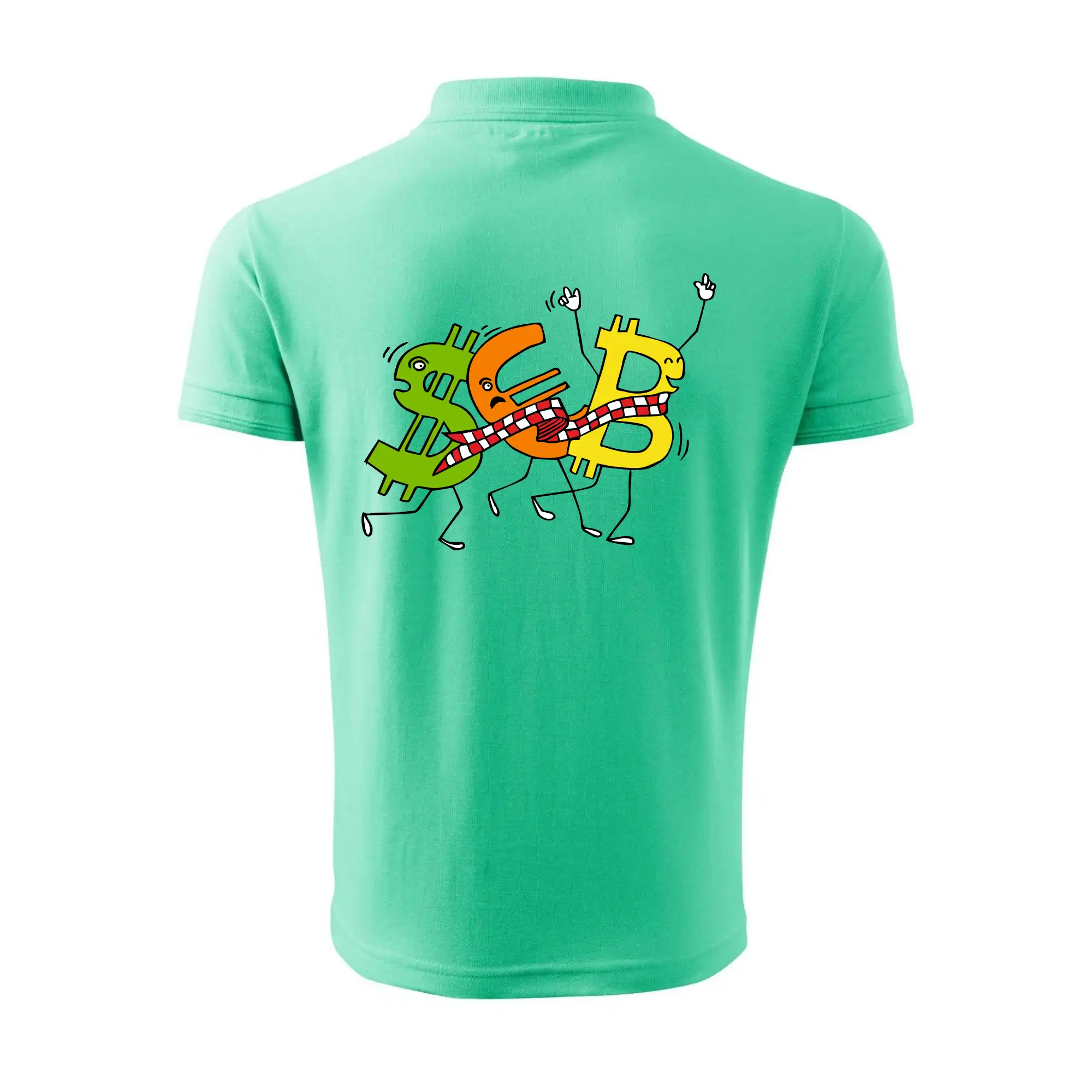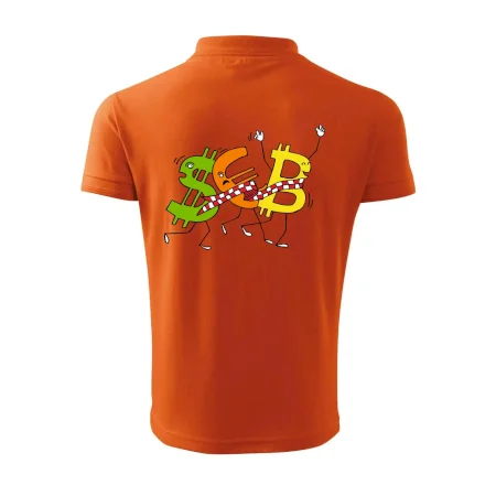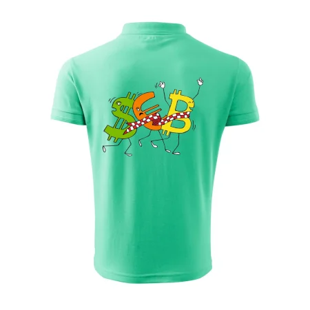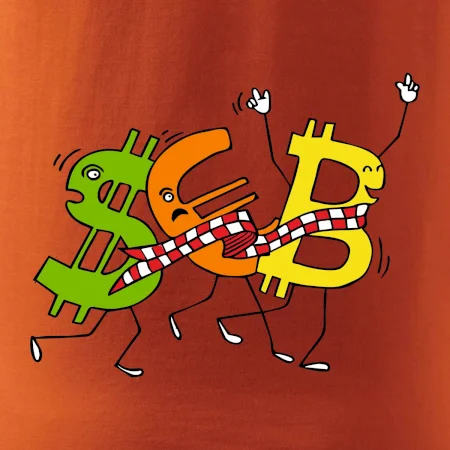 Menové tričko so symbolmi dolár, euro a bitcoin. Tričko pre zmenárnika alebo bankára.