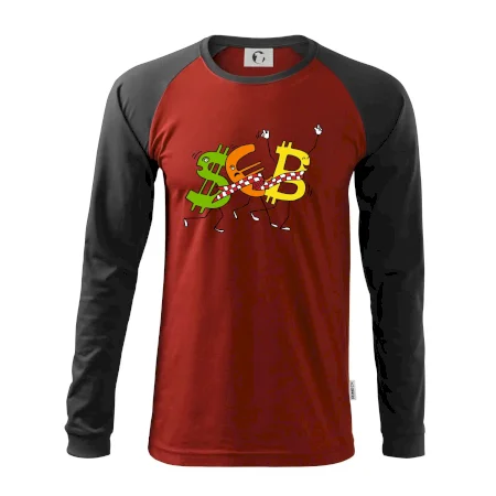 Menové tričko so symbolmi dolár, euro a bitcoin. Tričko pre zmenárnika alebo bankára.