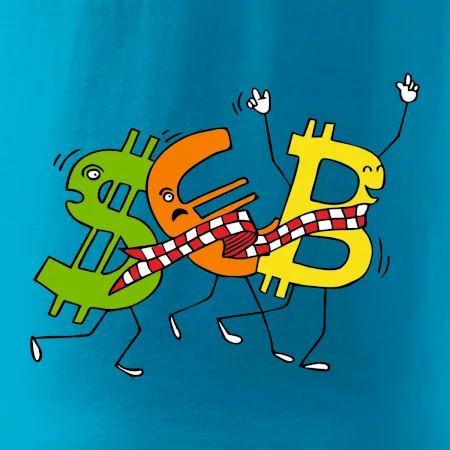 Menové tričko so symbolmi dolár, euro a bitcoin. Tričko pre zmenárnika alebo bankára.