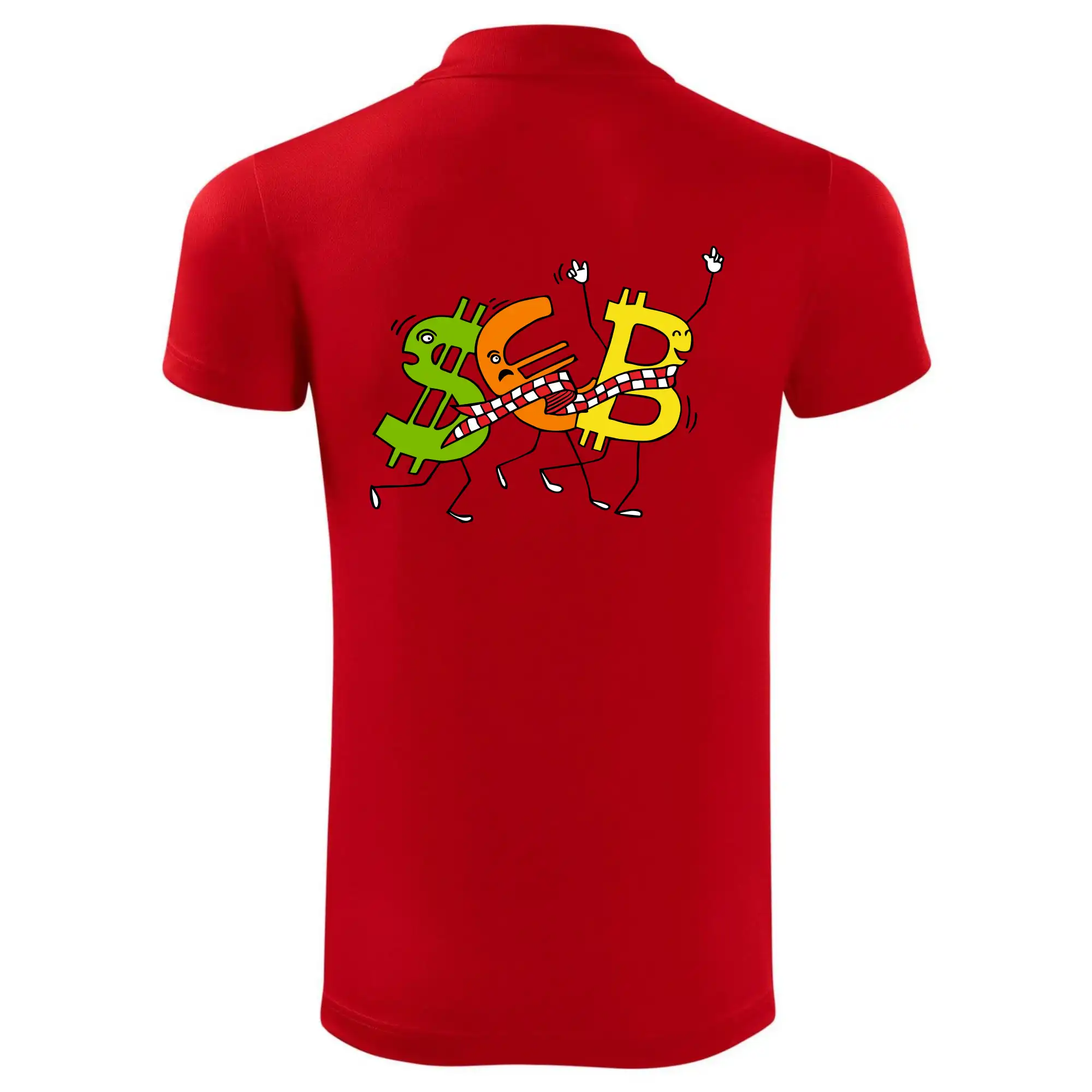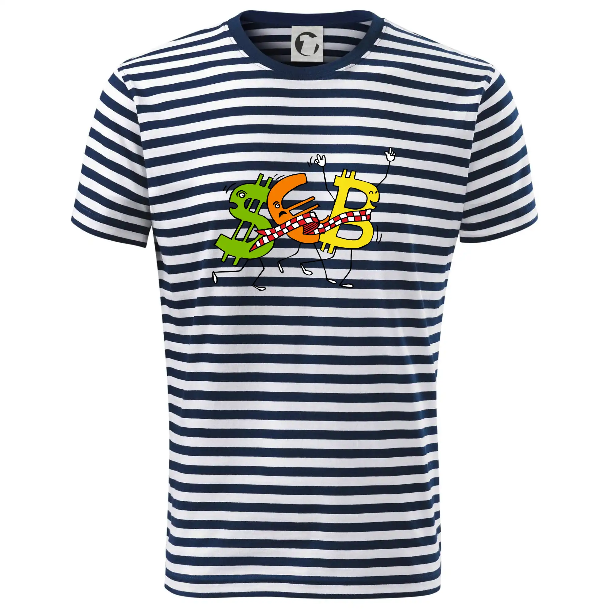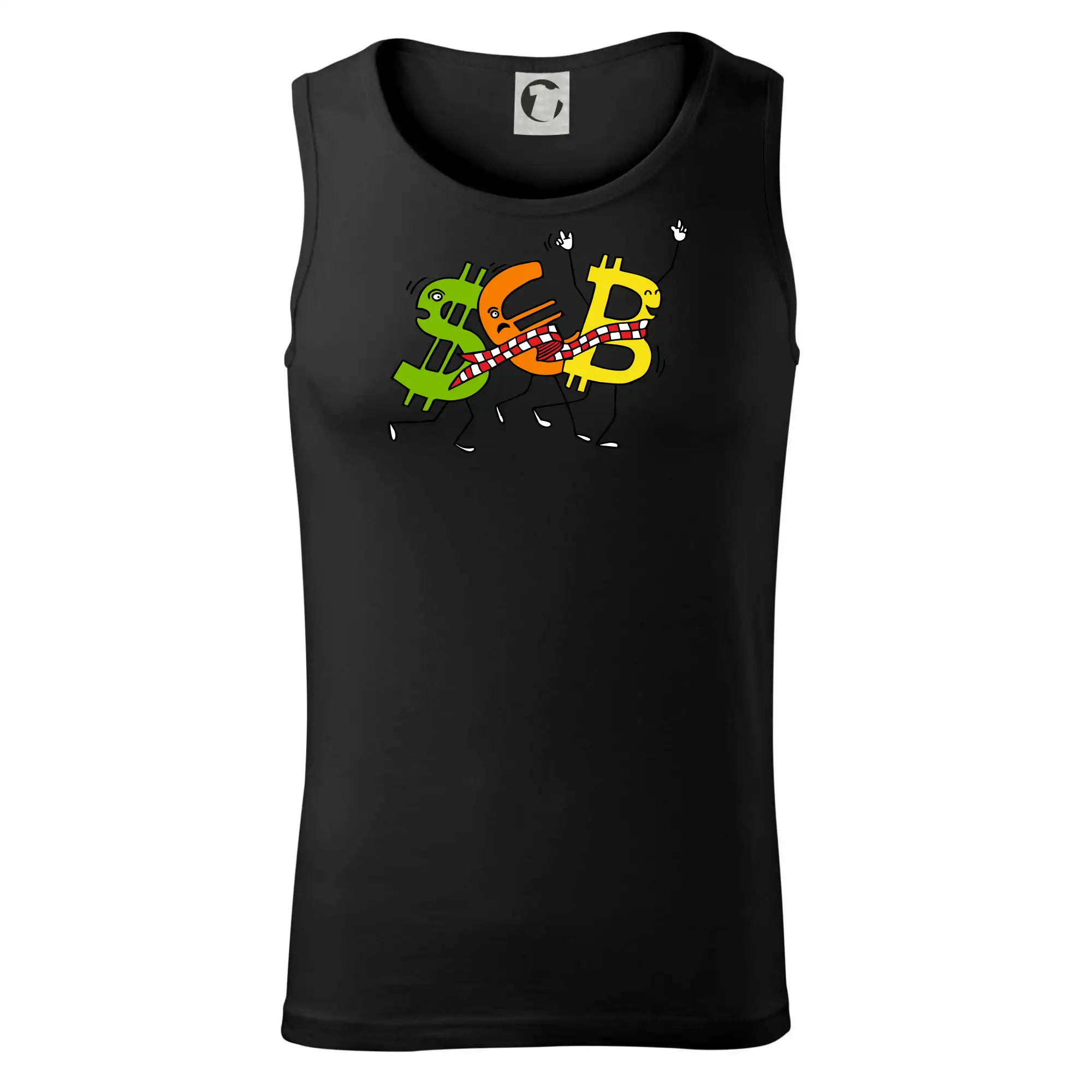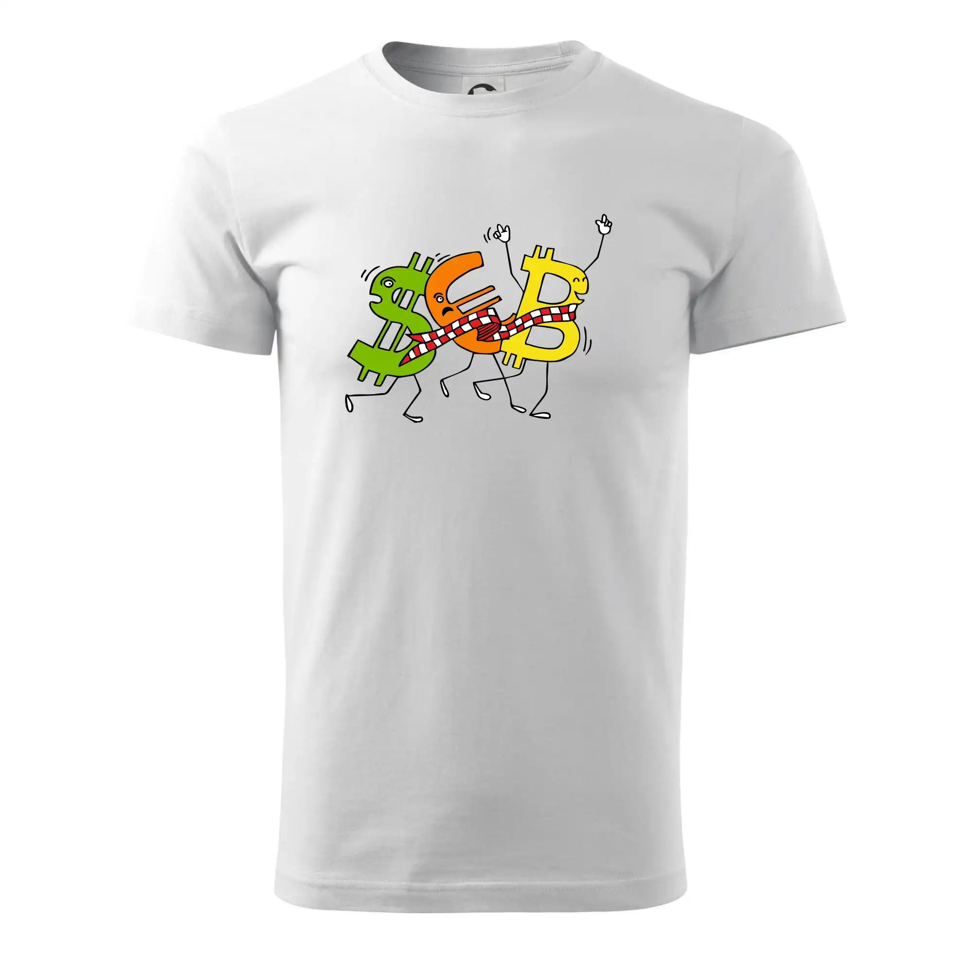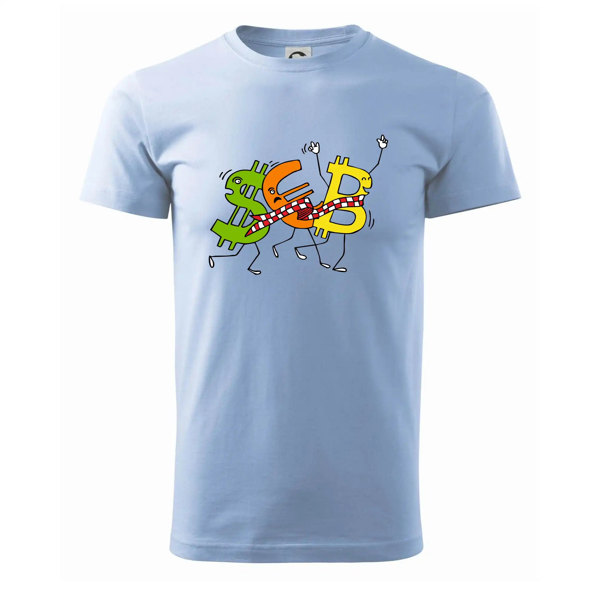 Menové tričko so symbolmi dolár, euro a bitcoin. Tričko pre zmenárnika alebo bankára.