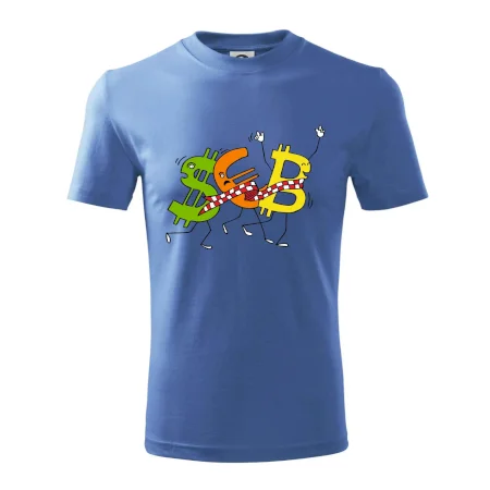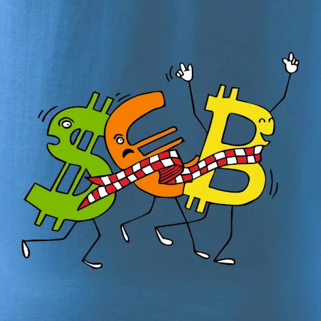 Menové tričko so symbolmi dolár, euro a bitcoin. Tričko pre zmenárnika alebo bankára.