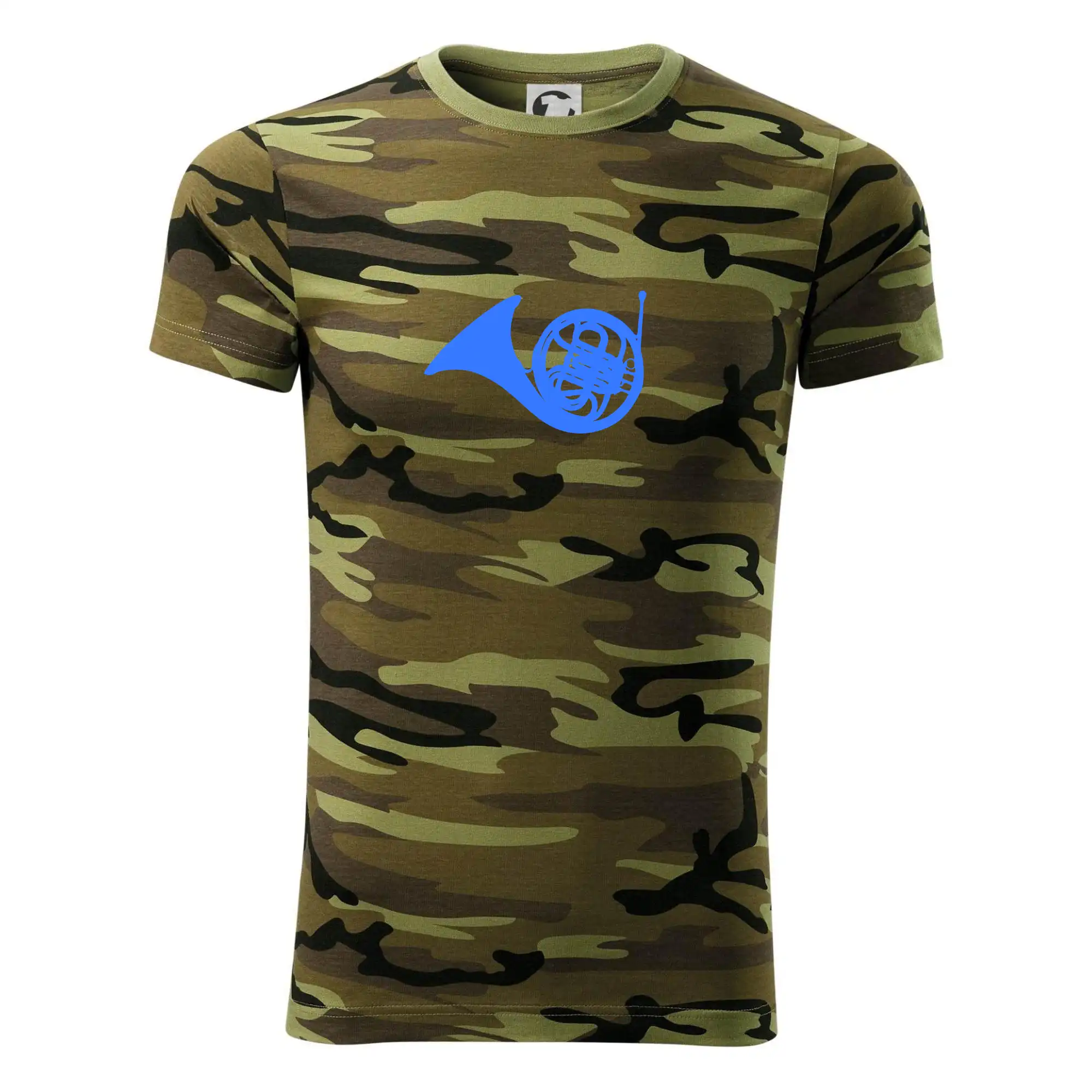 Tričko strednej gramáže vo farbách camouflage. Strih s bočnými švami. Lem priekrčníku z rebrového úpletu s prídavkom 5% elastanu. Vnútorná časť zadného priekrčníka začistená páskou vo farbe camouflage.