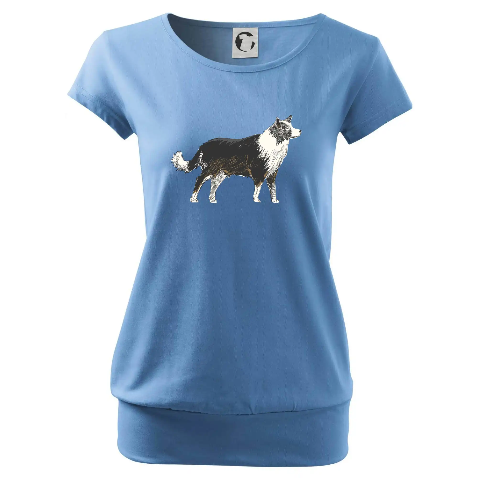Trendové dámske tričko s veľmi krátkym rukávom, voľnejšieho strihu, v dolnom kraji všité do širokého lemu. Okrúhly priekrčník s úzkym lemom zo zhodného materiálu.