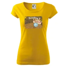 Trendové dámske tričko s veľmi krátkym rukávom, voľnejšieho strihu, v dolnom kraji všité do širokého lemu. Okrúhly priekrčník s úzkym lemom zo zhodného materiálu.