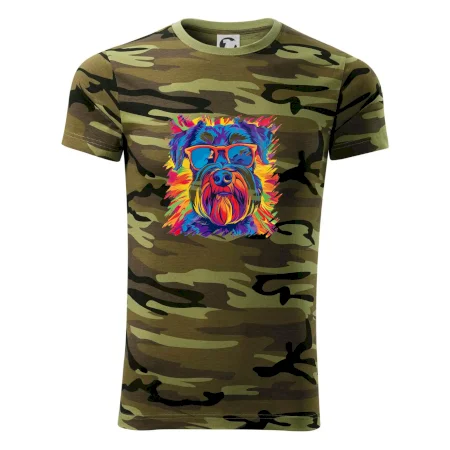 Tričko strednej gramáže vo farbách camouflage. Strih s bočnými švami. Lem priekrčníku z rebrového úpletu s prídavkom 5% elastanu. Vnútorná časť zadného priekrčníka začistená páskou vo farbe camouflage.